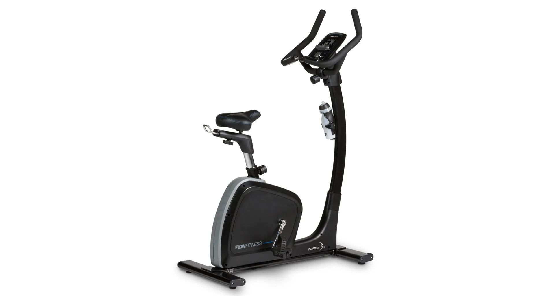 Součástí výbavy Flow Fitness B2i je počítač s držákem na tablet a bluetooth přijímačem, transportní kolečka, vyrovnávače nerovnosti a držák na lahev.