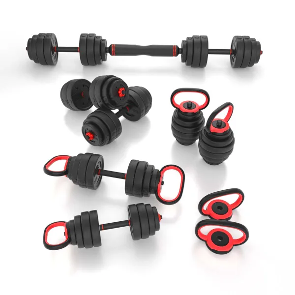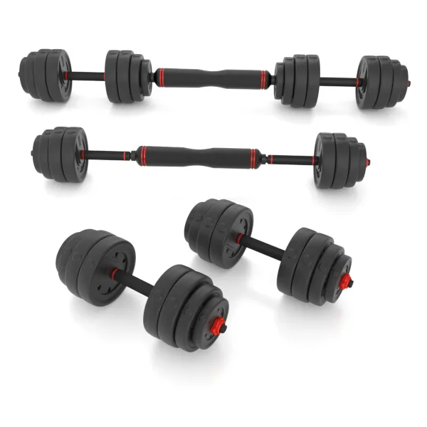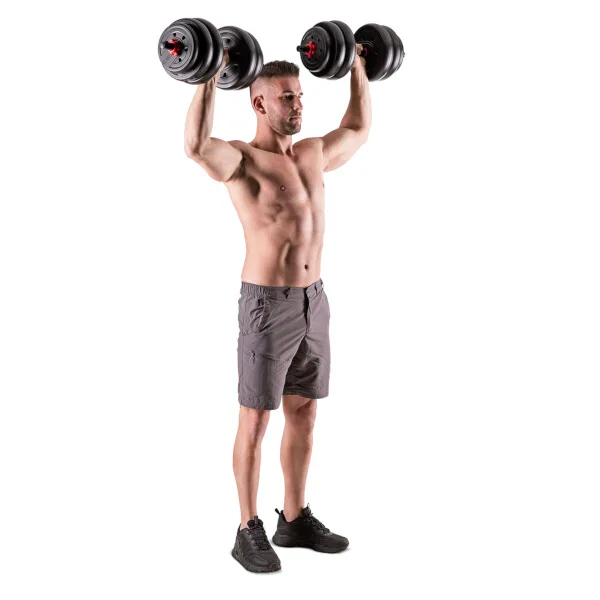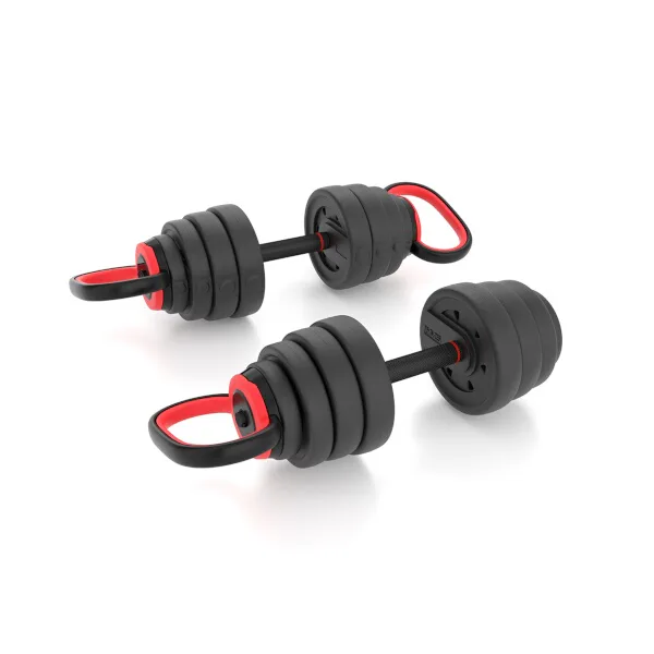 Nakládací jednoručky mají vroubkovaný úchop pro jistý stisk a závaží se fixují pomocí šroubovacích, hvězdicových objímek.