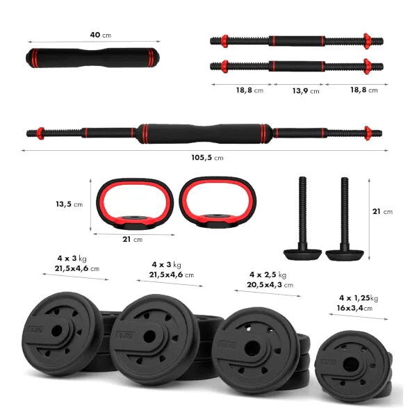 Kettlebell se skládá z 21 centimetrů dlouhého, nakládacího trnu, na který se vyskládají kotouče o požadované hmotnosti a ty se zajistí našroubováním úchopu.