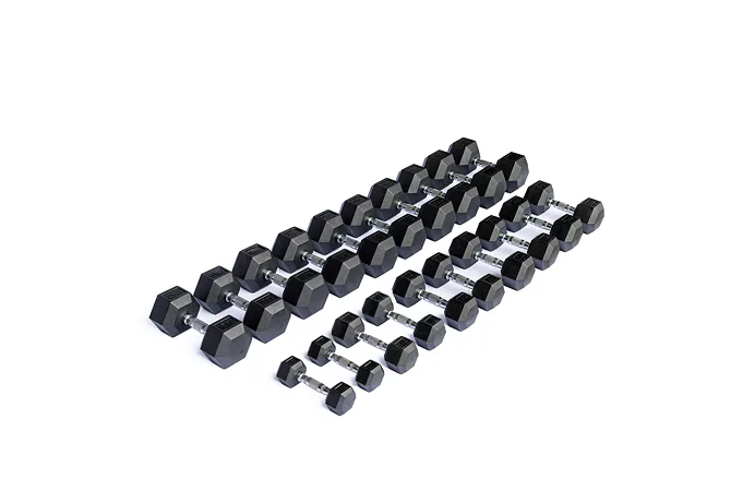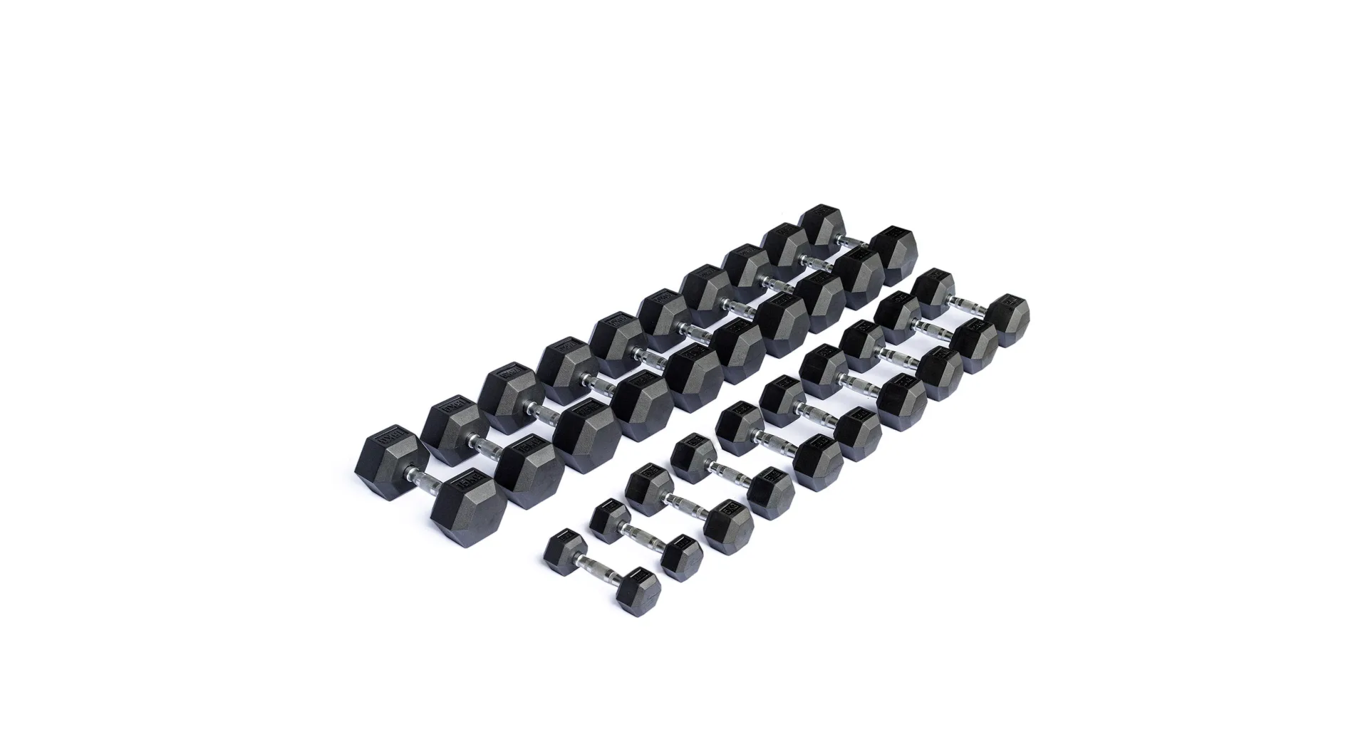 Profesionální sada pogumovaných jednoručních činek se skládá z 10 párů činek v rozmězí 2,5 až 25 kg po 2,5 kg. Činky mají pevnou konstrukci a odolnou gumovou povrchovou úpravu. Ergonomicky tvarovaný chromovaný úchop umožňuje pevný úchop a pohodlné, bezpečné cvičení. Pevná závaží mají v řezu praktický tvar šestiúhelníku, aby nedocházelo k samovolnému pohybu činky po doložení.