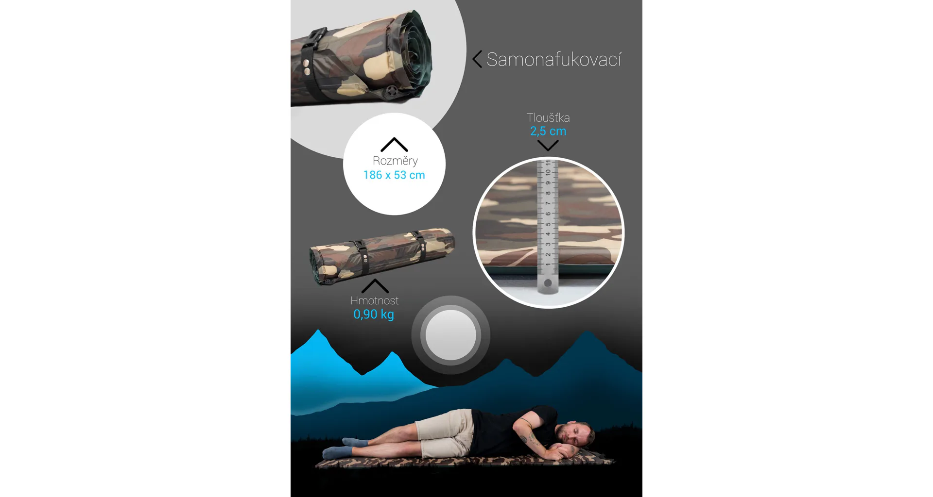Samonafukovací karimatka v provedení "maskáč" je vhodná pro pěší turistiku svým MALÝM OBJEMEM A ZÁROVEŇ I NÍZKOU HMOTNOSTÍ při zajištění pohodlného používání. Je i praktická pro používání pod širým nebem díky maskáčovému vzoru, který není tolik náchylný na ušpinění. Jedná se o velmi lehkou karimatku, která zajišťuje pohodlné spaní a zabere poměrně málo místa. Je možné napomoci rychlejšímu nafouknutí ústy, popřípadě tím lze docílit větší tuhosti karimatky. V některých případech je nutné karimatku při prvních dvou použitích ústy dofouknout, aby se pěna uvnitř roztáhla na patřičnou tloušťku a následně se již snadno nafukovala sama.
