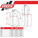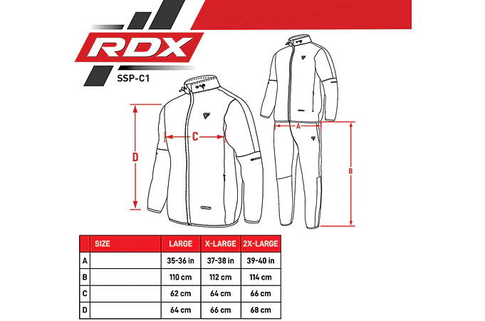 Sauna oblek RDX C1 je navržen tak, aby vyhovoval širokému spektru uživatelů a typů postavy. Dostupný je ve velikostech od L až po 2XL. Velikosti obleku jsou navrženy tak, aby poskytovaly dostatečnou volnost pohybu, aniž by docházelo k nepříjemnému pnutí nebo omezování při cvičení. Vzhledem k pružným manžetám a pružnému materiálu se oblek snadno přizpůsobí tvaru těla, což zvyšuje jeho komfort při nošení.