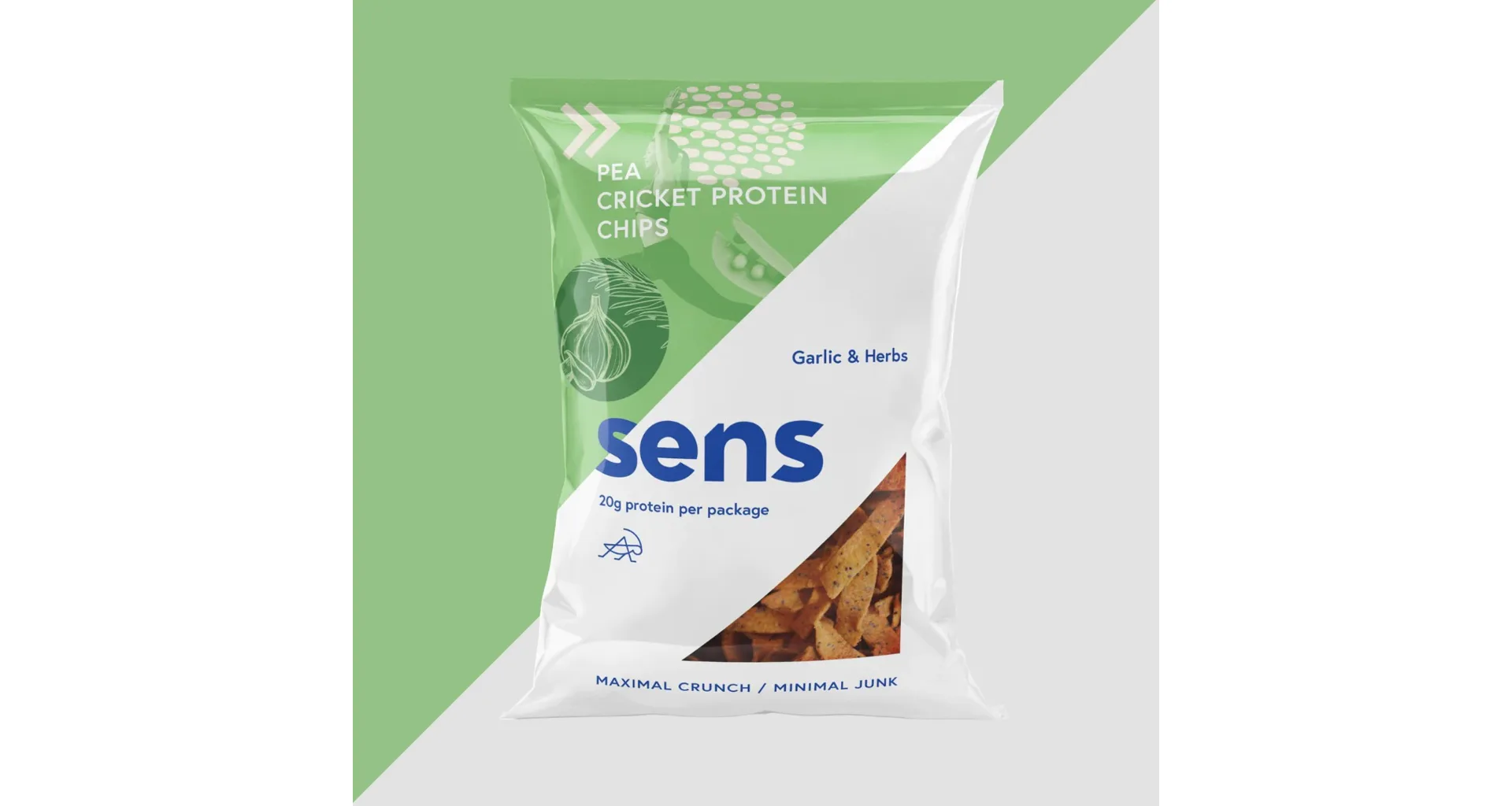 Složení proteinové chipsy (Česnek): hrachová mouka (75%), cvrččí mouka (Acheta domesticus) (10%), česnek (7%), slunečnicový olej, bylinky (3,2%) (medvědí česnek, paprika, saturejka, bazalka, pepř, oregano, tymián), bramborový škrob, kvasničný extrakt., sůl.