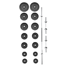 Variabilní činkový komplet sestavený z kvalitních komponentů je vynikajícím doplňkem každé domácí i komerční posilovny. Rozmanitá skladba setu zaručuje komfortní a bezpečný trénink. Součástí tohoto setu je velká obouruční hřídel na činku, dvě jednoruční hřídele a sada litinových kotoučů, vše s vrtáním 30 mm (průměr používaný i většinou výrobců posilovacích lavic a strojů). Uvedená váha setu je včetně osy.