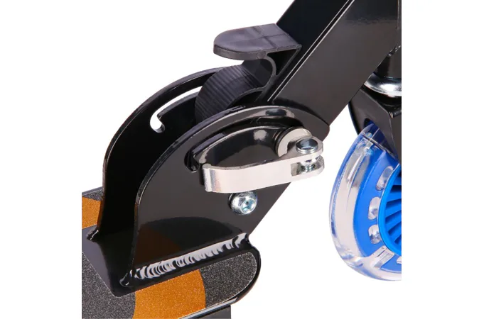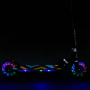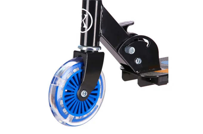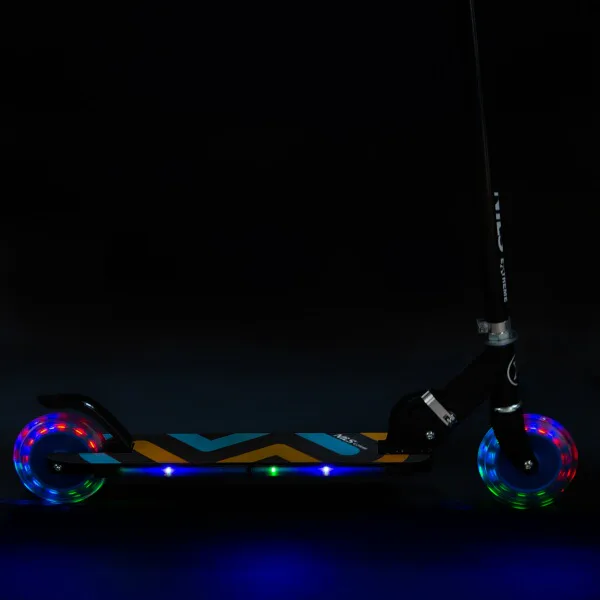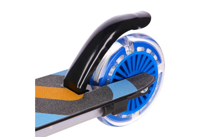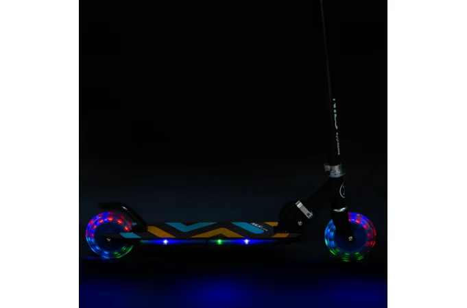 Kolečka o průměru 125 milimetrů jsou osazena barevnými LED diodami, ty slouží jako zajímavý, vizuální prvek, zvyšují zájem dětí a v neposlední řadě zvyšují viditelnost koloběžky například za šera. Kolečka svítí automaticky během jejich otáčení. Dále jsou kolečka osazeny ložisky ABEC 5 pro pohodovou jízdu. Zadní blatník slouží jako nášlapná brzda pro bezpečné zastavení koloběžky.