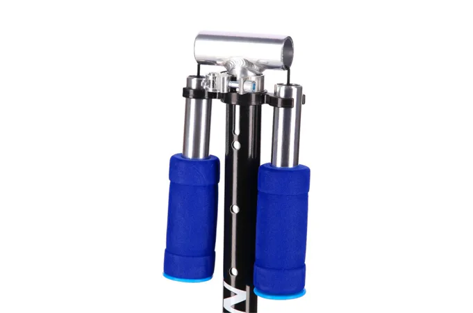 Teleskopická řídítka jsou výškově nastavitelná do 4 poloh (60 - 68 - 73 - 78 cm od země). Změna nastavení výšky se provádí uvolněním páčky rychloupínáku, stisknutím pojistného čepu a vysunutím, nebo zasunutím vnitřní tyče řídítek. Pro úsporu místa lze řídítka složit - k tomu je potřeba uvolnit páčku spodního rychloupínáku a potáhnout táhlo směrem nahoru, řídítka lze následně sklopit. Gripy na řídítkách jsou vyrobeny z TPR pro pevný a pohodlný úchop, šířka řídítek je 32 centimetrů a madla lze sklopit.