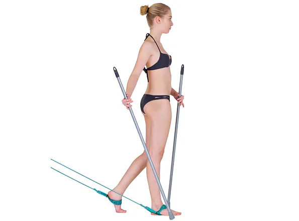 Kromě elastického lana se ke cvičení používá také balanční podložka a pro náročnější cviky pak dvojice opěrných tyčí.