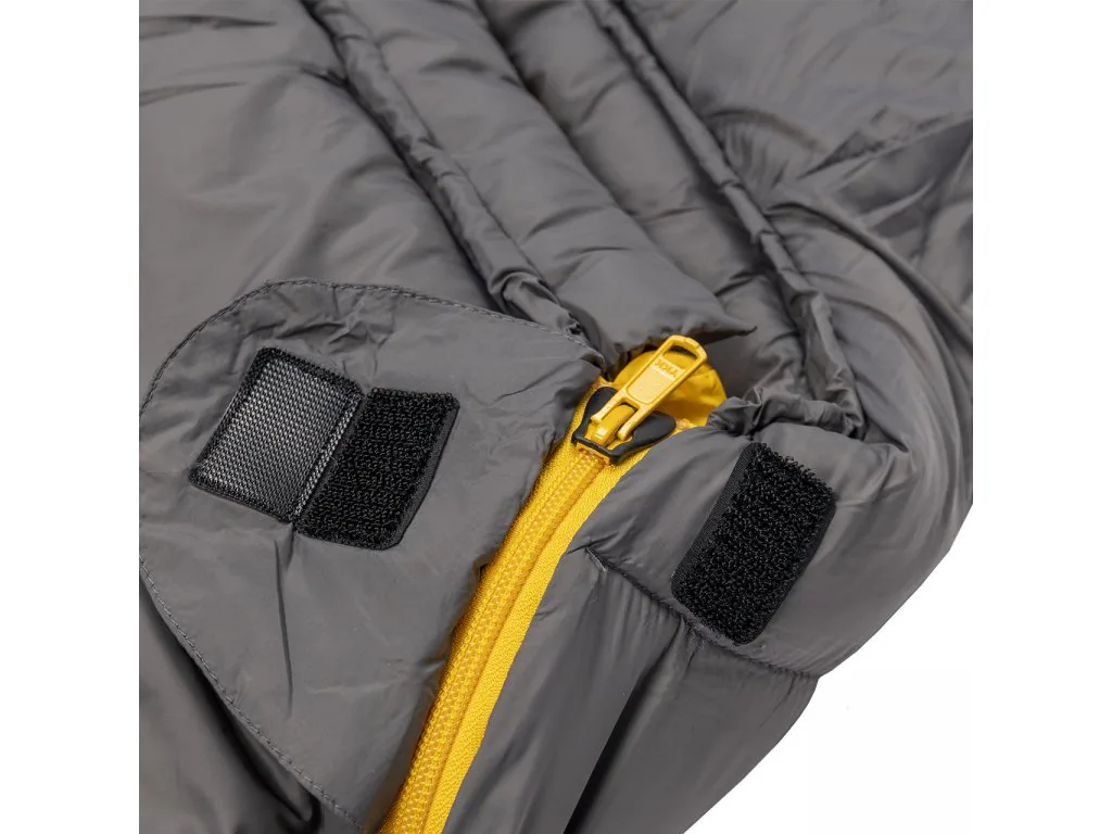 Zapínání: spacák je vybaven značkovým zipem YKK se speciálním plastovým chráničem, který zabraňuje vniknutí látky do jezdce a samovolnému rozepínání. U hlavy je zip ještě zajištěn klopou na suchý zip, která zamezuje samovolnému otevření zipu.