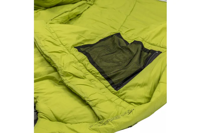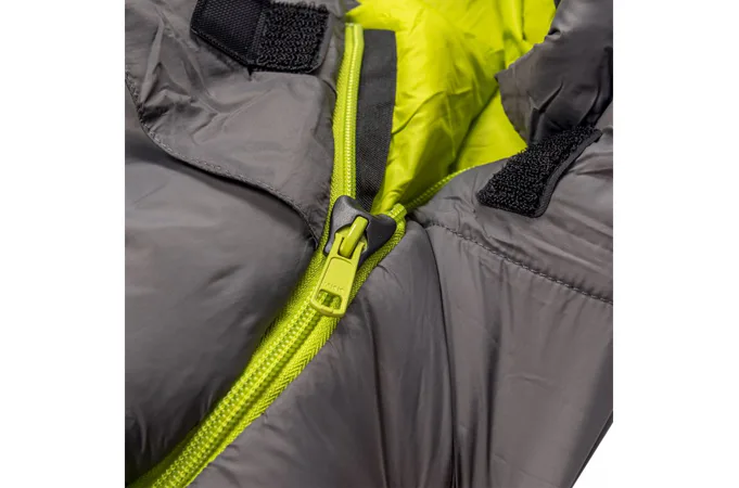 Zapínání: spacák je vybaven značkovým zipem YKK se speciálním plastovým chráničem, který zabraňuje vniknutí látky do jezdce a samovolnému rozepínání. U hlavy je zip ještě zajištěn klopou na suchý zip, která zamezuje samovolnému otevření zipu.