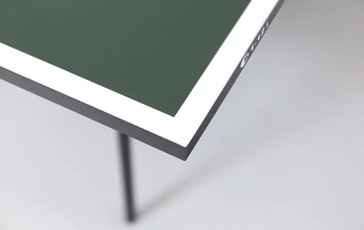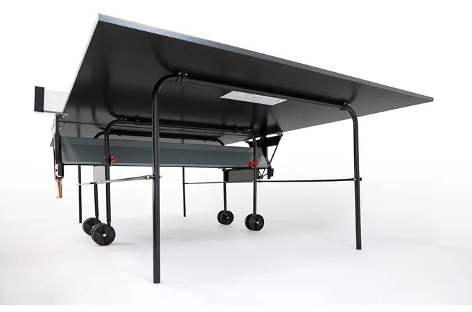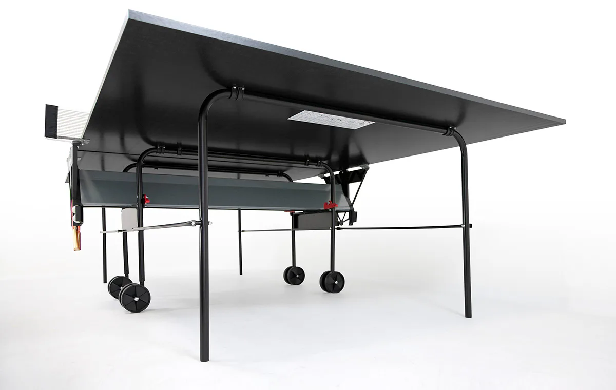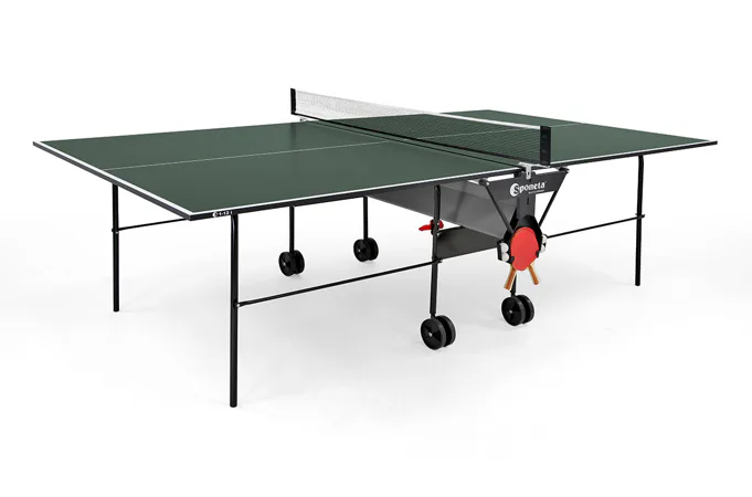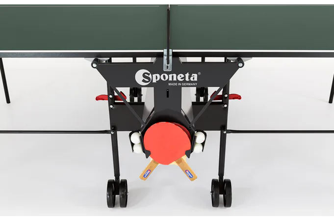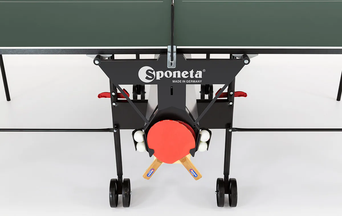 Stůl na stolní tenis Sponeta S1-12i s pojezdem, síťka, držák na síťku je součástí vybavení stolu. Rekreační stůl s 19 mm silnou deskou a kovovými výztuhami je určený pro vnitřní použití. Odpovídá nové evropské bezpečnostní normě. Konstrukce stolu je tvořena trubkovým profilem o průměru 25 mm.