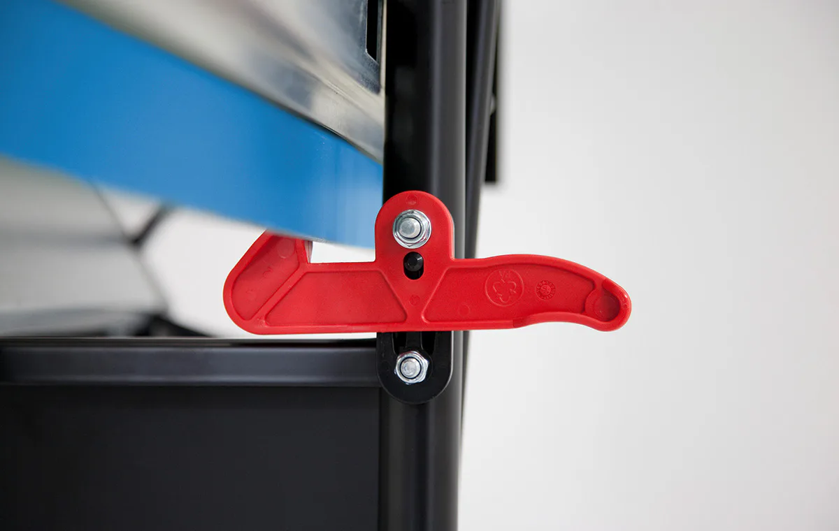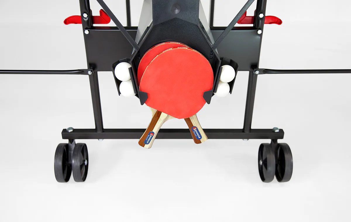 Stůl na stolní tenis Sponeta S1-13e je možné složit, aniž by bylo nutné demontovat držák na síťku se síťkou. Kolečka umožňující pojezd usnadňují manipulaci se stolem.