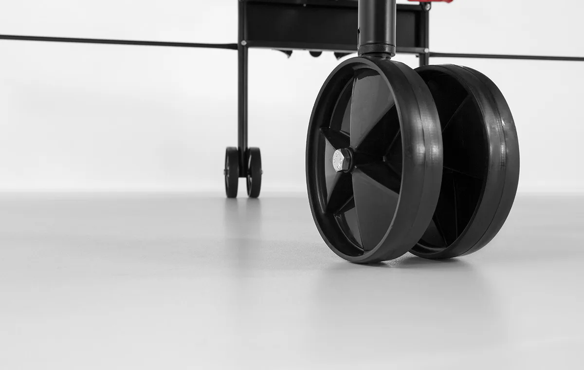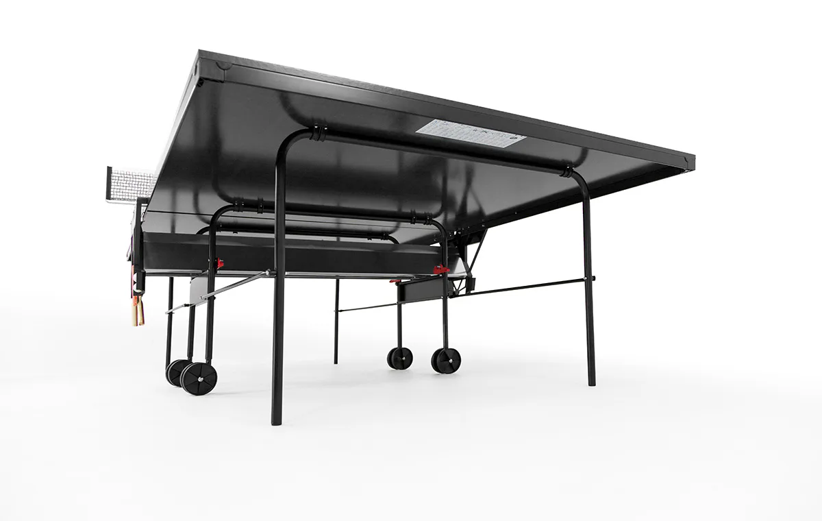 Pingpongový stůl se díky sklopné konstrukci snadno skladuje a přenáší bez nutnosti jeho složité demontáže a pojezdová kolečka velmi usnadňují manipulaci. Pod stolem je držák na pálky a na míčky.