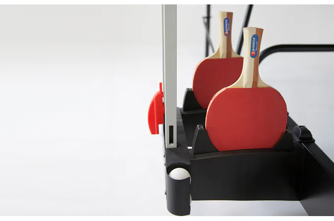 Síťka a držák na síťku je součástí vybavení stolu. Součástí stolu je také držák na pálky a na míčky