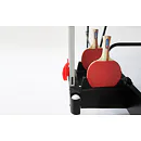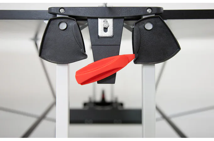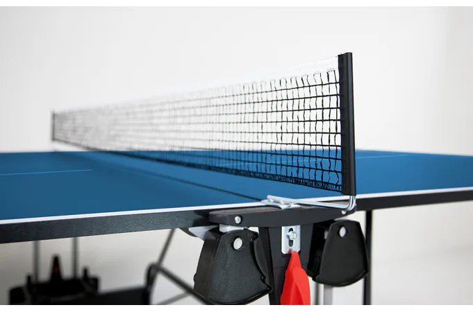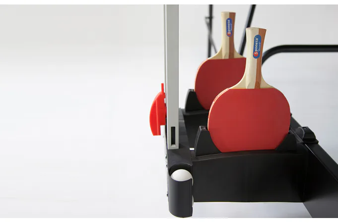 Síťka a držák na síťku je součástí vybavení stolu. Součástí stolu je také držák na pálky a na míčky