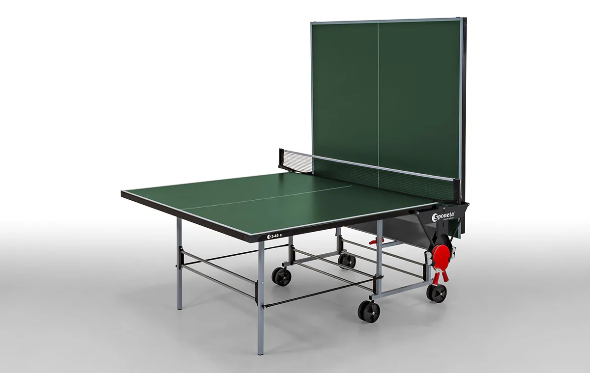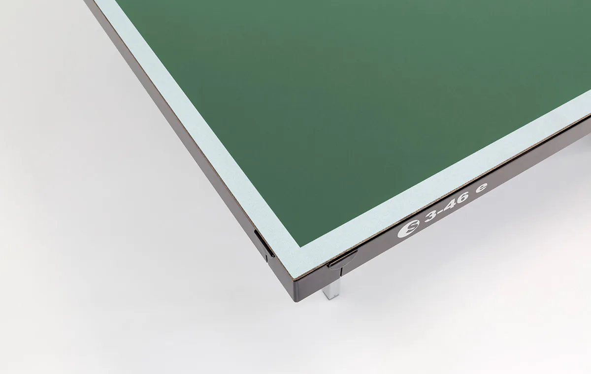 Stůl na stolní tenis Sponeta S3-46e, venkovní. Pozinkovaný rám spolu se 5 mm silnou plastovou deskou z melaminu, která má vlastnosti klasické dřevěné desky, umožňují stálé umístění stolu venku (přesto doporučujeme pro prodloužení životnosti nechávat stůl venku pouze od jara do podzimu - sníh a led mohou stůl mechanicky poškodit) bez ohledu na momentální klimatické podmínky.
