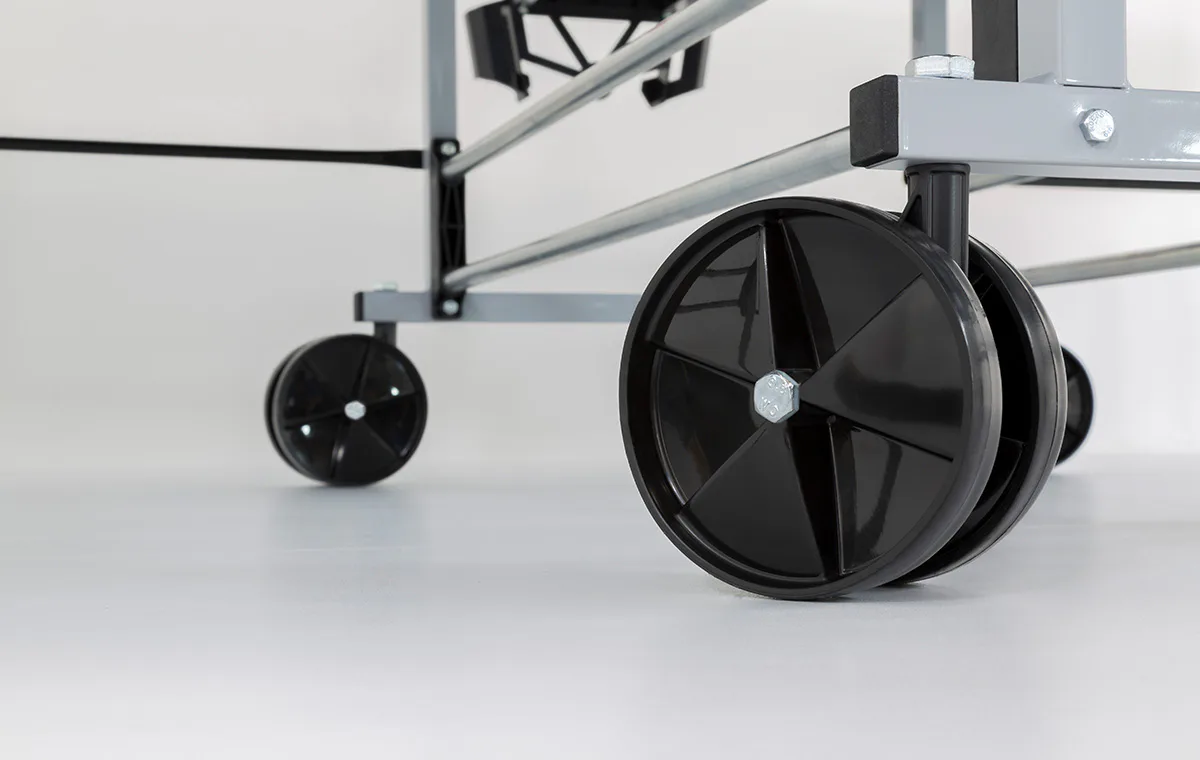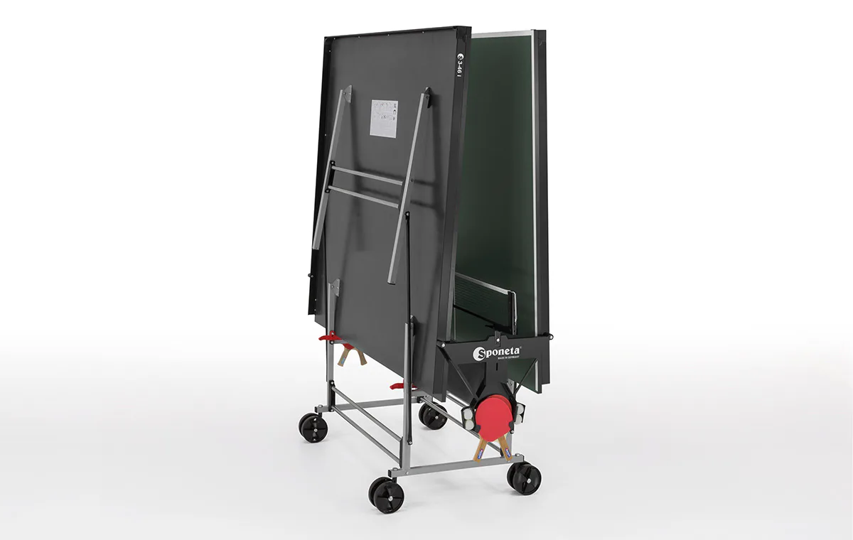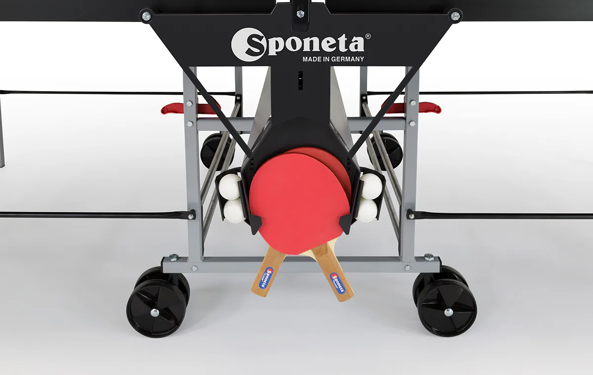 Vnitřní část stolu je opatřena čtyřmi kolečky na manipulaci ve složeném stavu. Uprostřed stolu je držák na pálky a na míčky. Síťka a držák na síťku je součástí vybavení stolu.