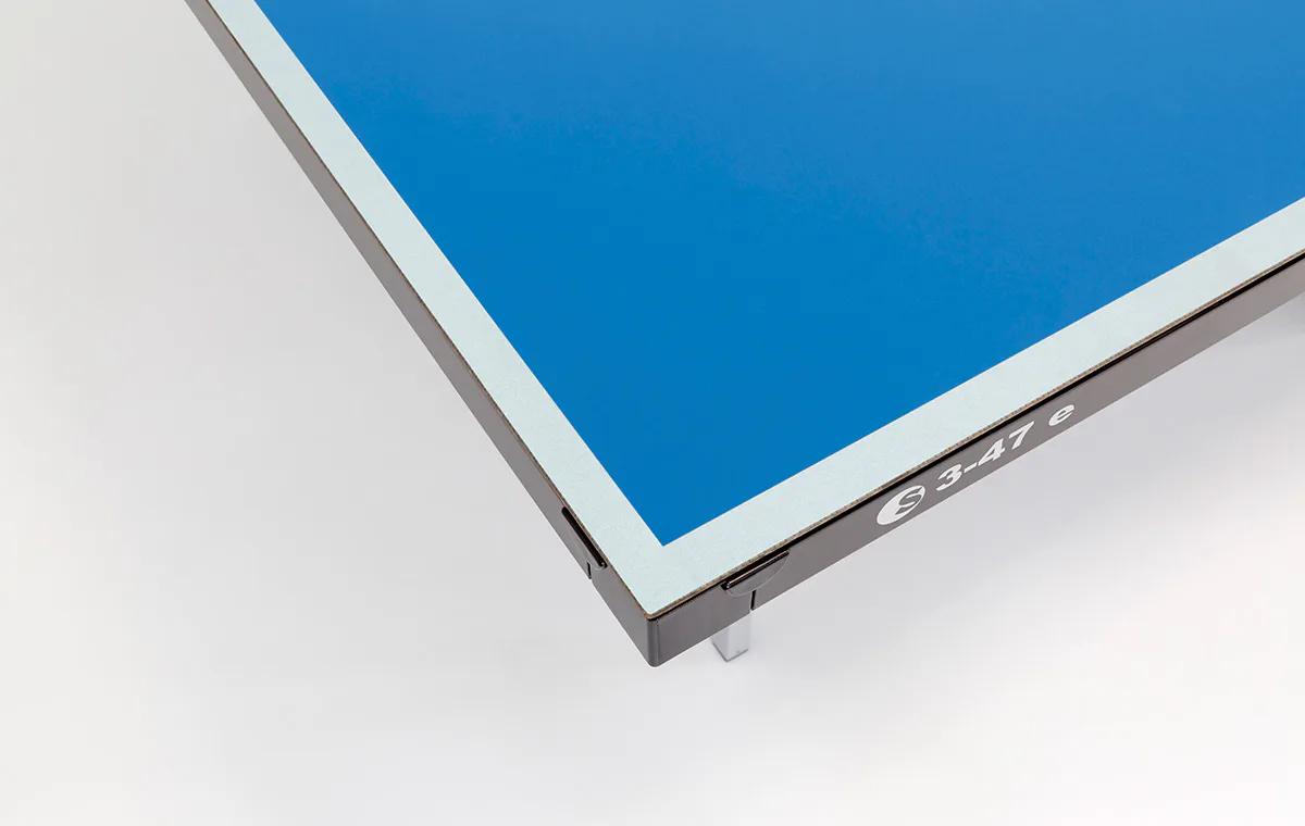 Stůl na stolní tenis Sponeta S3-47e, venkovní. Pozinkovaný rám spolu se 5 mm silnou plastovou deskou z melaminu, která má vlastnosti klasické dřevěné desky, umožňují stálé umístění stolu venku (přesto doporučujeme pro prodloužení životnosti nechávat stůl venku pouze od jara do podzimu - sníh a led mohou stůl mechanicky poškodit) bez ohledu na momentální klimatické podmínky.