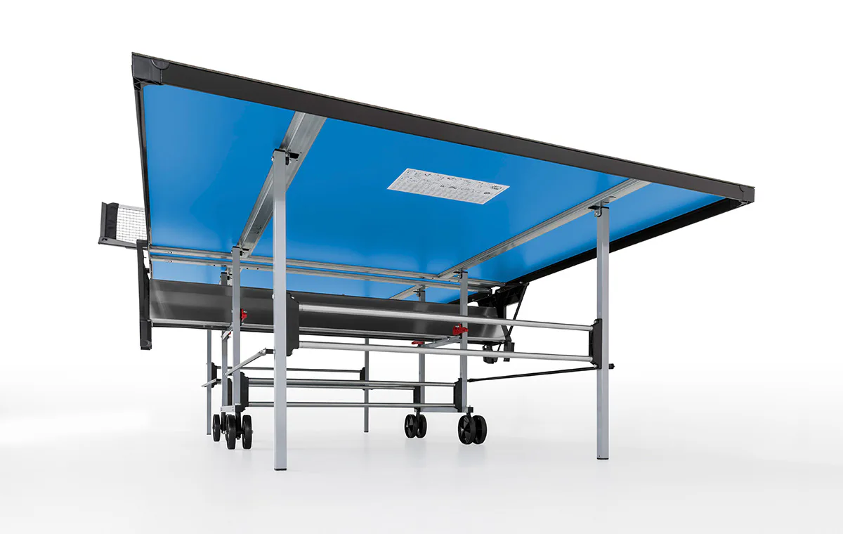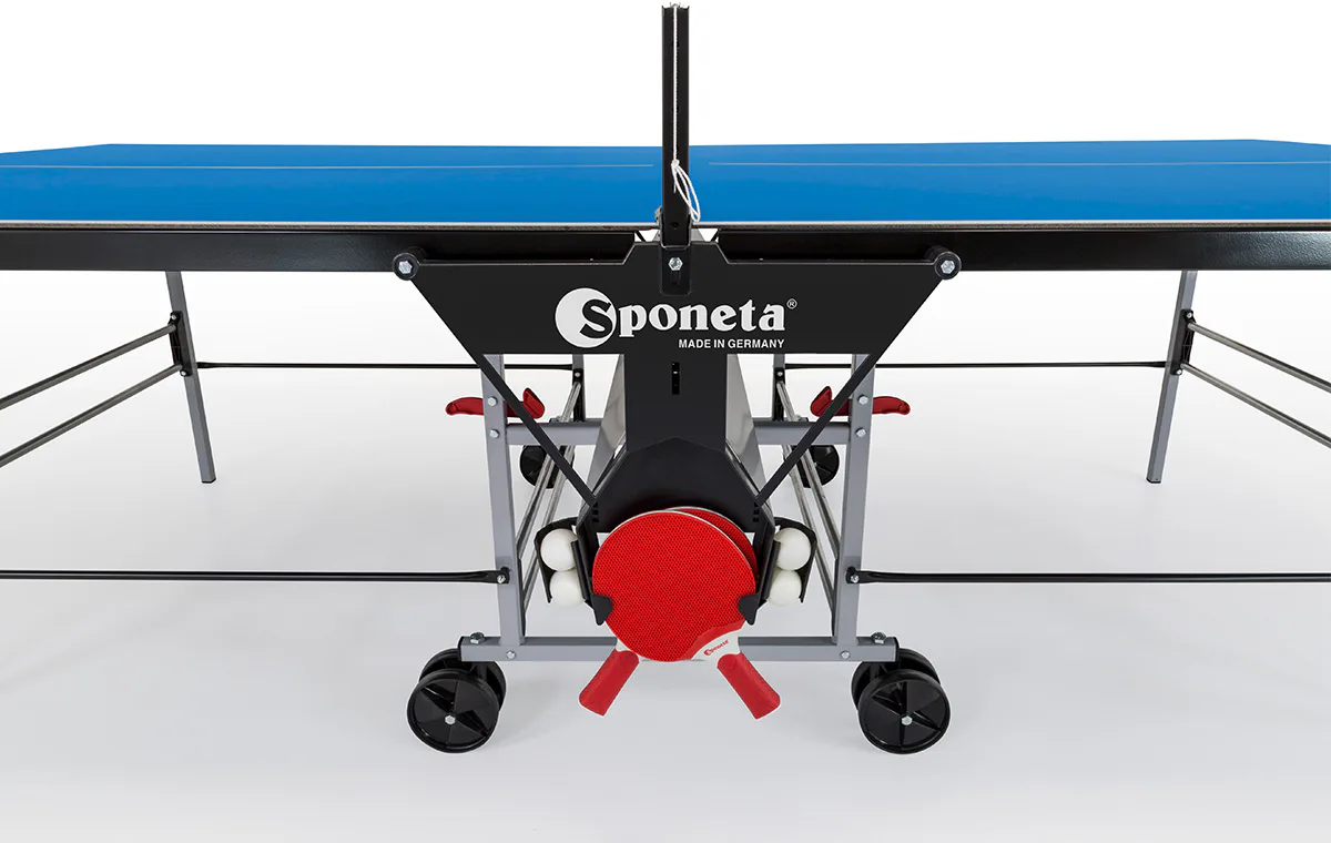 Stůl na stolní tenis Sponeta S3-47e je možné složit, aniž by bylo nutné demontovat držák na síťku se síťkou. Pevný rám z profilů 2,5 x 2,5 cm dává stolu velkou stabilitu rovnající se vnitřním stolům.