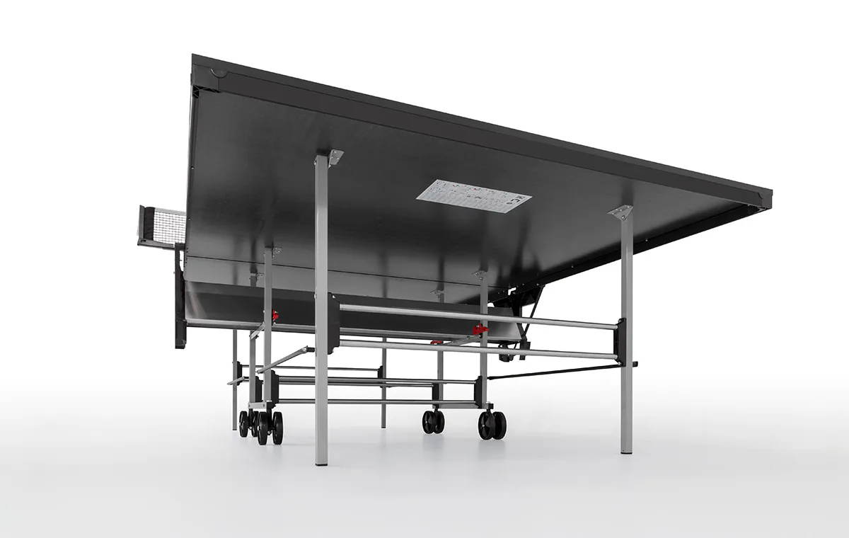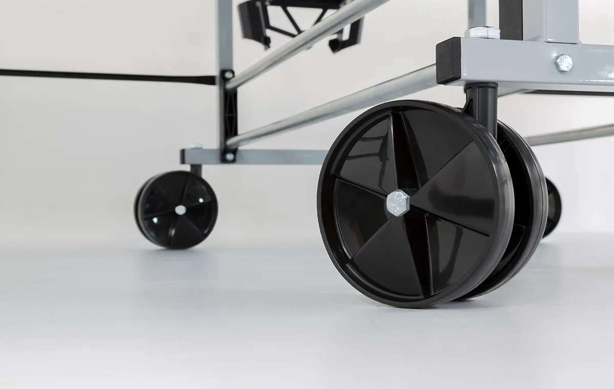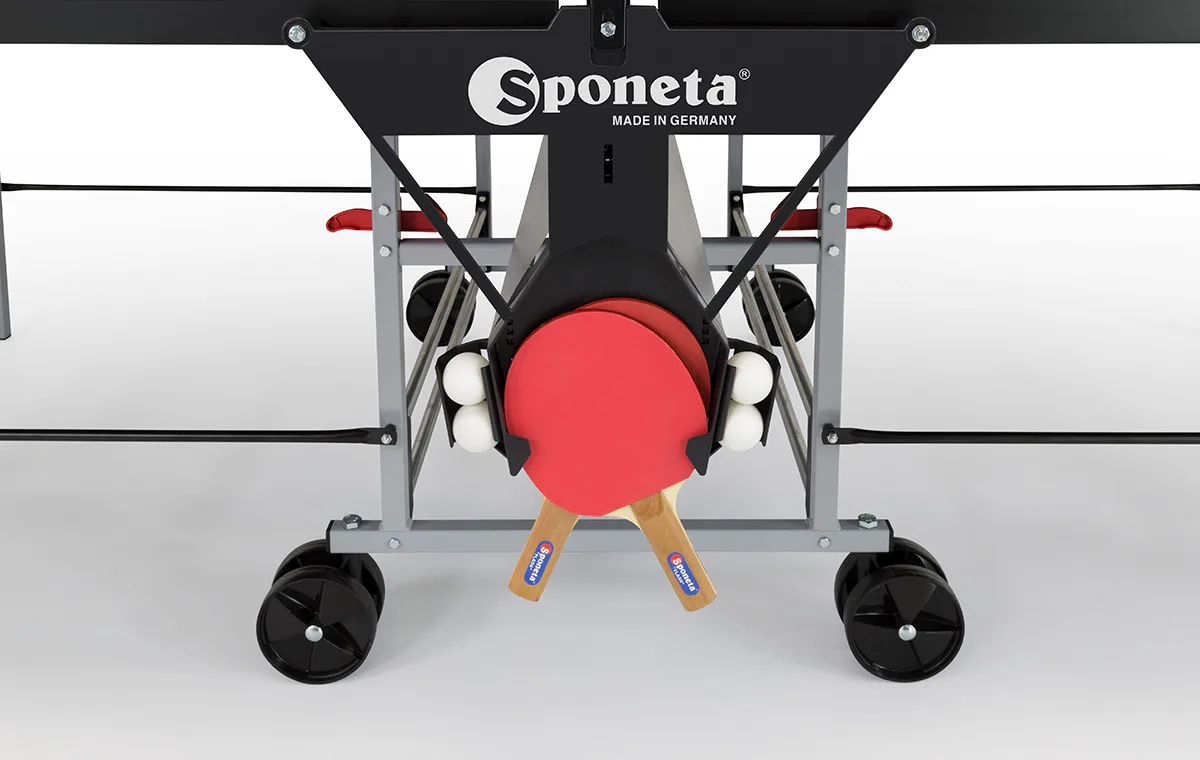 Vnitřní část stolu je opatřena čtyřmi kolečky na manipulaci ve složeném stavu. Uprostřed stolu je držák na pálky a na míčky. Síťka a držák na síťku je součástí vybavení stolu.