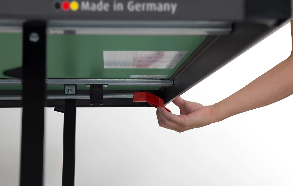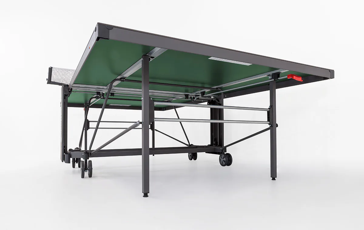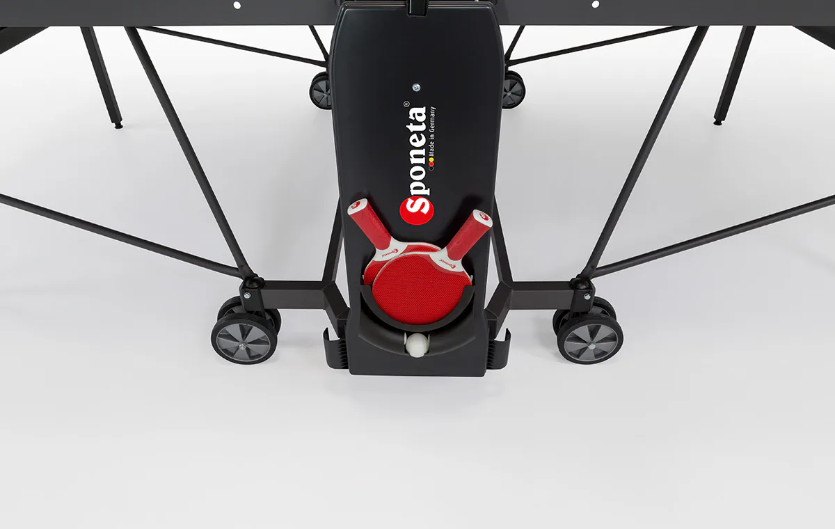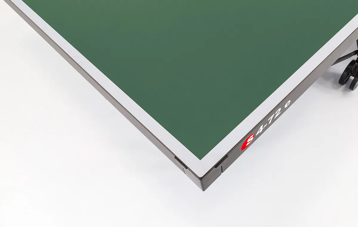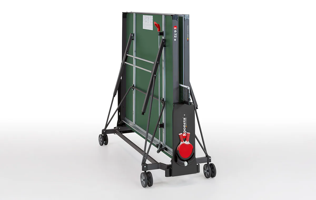Stůl na stolní tenis SPONETA S4-72e je možné složit, aniž by bylo nutné demontovat držák na síťku se síťkou. Výhodou tohoto modelu je možnost sklápění desek jen z jedné strany a není potřeba stůl obcházet nebo mít k sobě ještě další pomoc. Pevný rám z profilů 3 x 3 cm dává stolu velkou stabilitu rovnající se vnitřním stolům. 4 pogumovaná kolečka o průměru 128 mm umožňují tichý pojezd a usnadňují manipulaci se stolem.