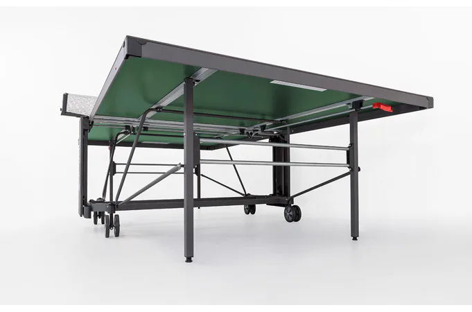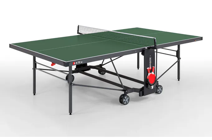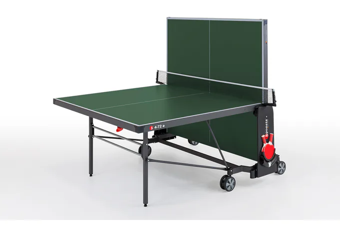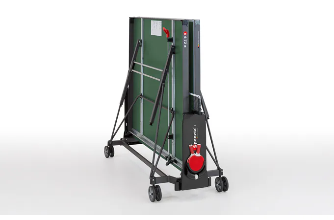 Stůl na stolní tenis SPONETA S4-72e je možné složit, aniž by bylo nutné demontovat držák na síťku se síťkou. Výhodou tohoto modelu je možnost sklápění desek jen z jedné strany a není potřeba stůl obcházet nebo mít k sobě ještě další pomoc. Pevný rám z profilů 3 x 3 cm dává stolu velkou stabilitu rovnající se vnitřním stolům. 4 pogumovaná kolečka o průměru 128 mm umožňují tichý pojezd a usnadňují manipulaci se stolem.