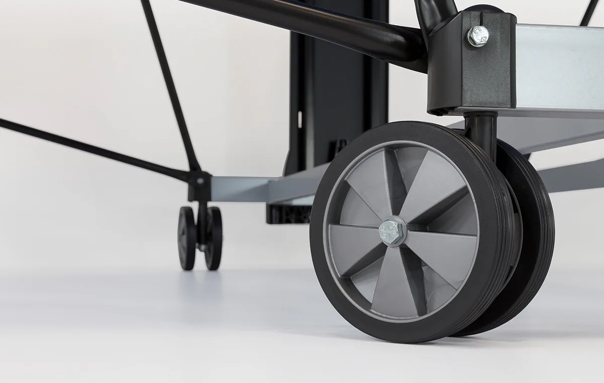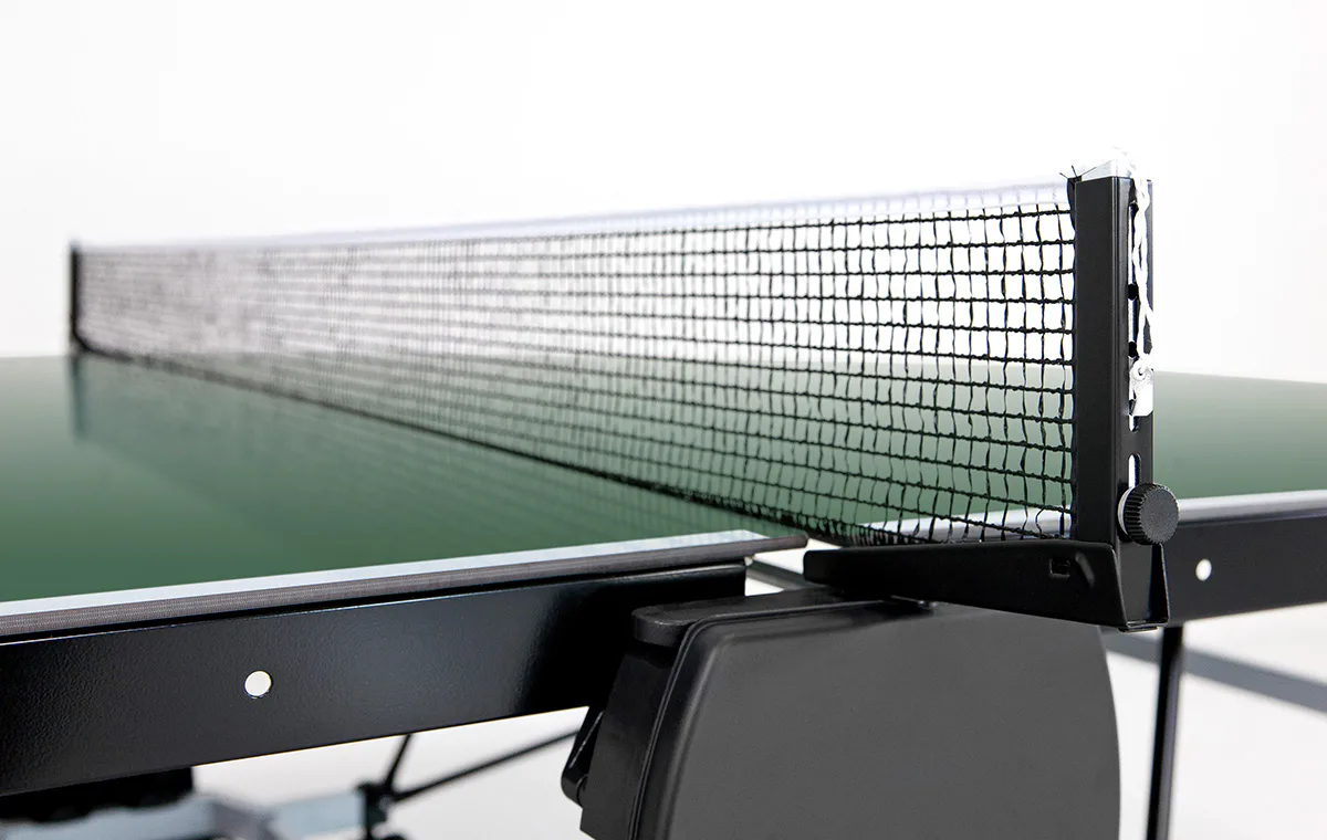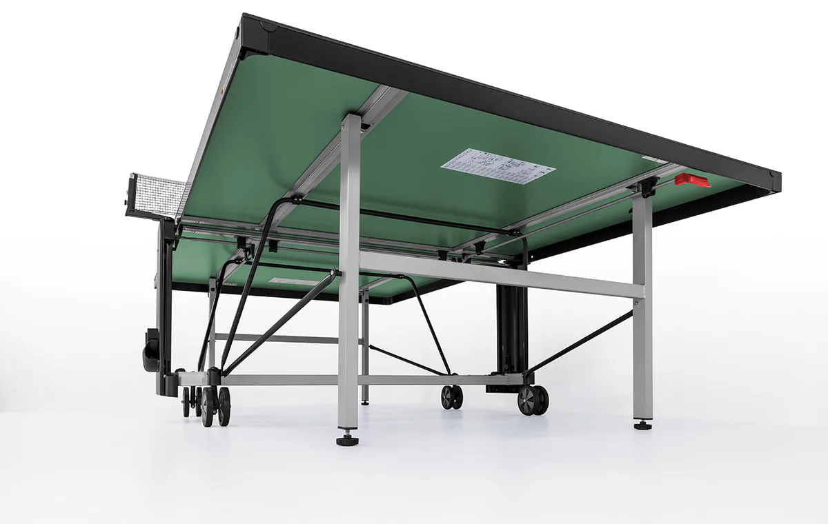 Pevný rám z profilů 5 x 5 cm dává stolu velkou stabilitu rovnající se vnitřním stolům. Nohy stolu jsou opatřené plastovými šrouby na vyrovnání nerovností terénu. Součástí stolu je i kvalitní držák na síťku, síťka a držák na 2 pálky a 4 míčky.