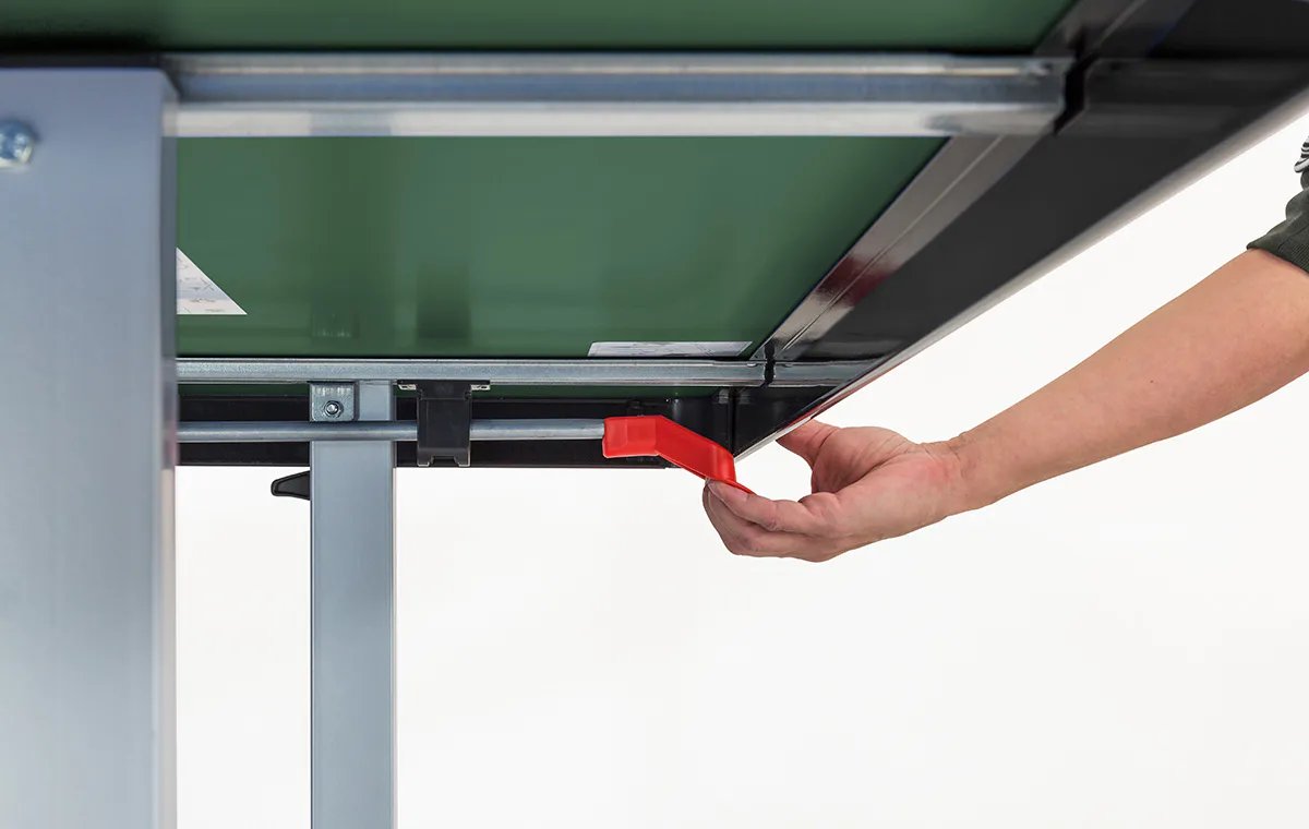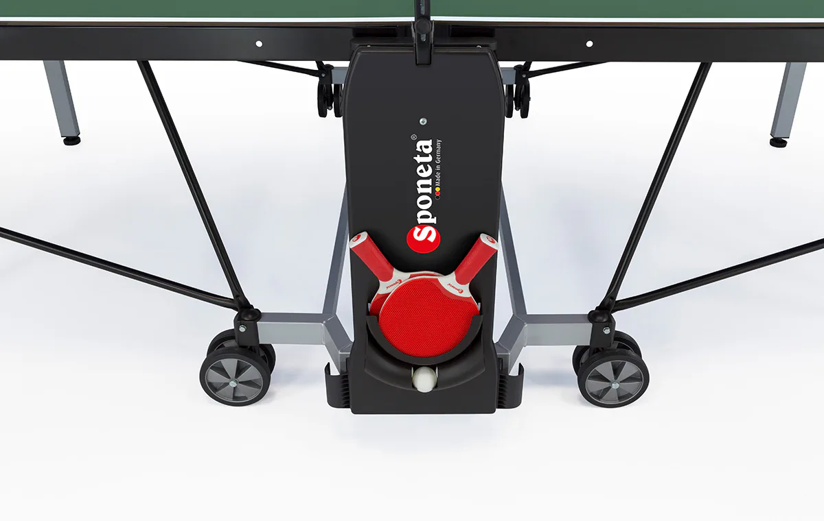 Stůl na stolní tenis Sponeta S5-72e je možné složit, aniž by bylo nutné demontovat držák na síťku se síťkou. Výhodou tohoto modelu je možnost sklápění desek jen z jedné strany a není potřeba stůl obcházet nebo mít k sobě ještě další pomoc.