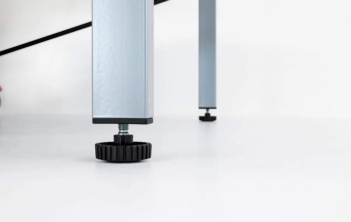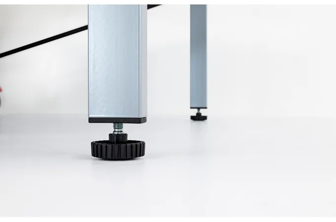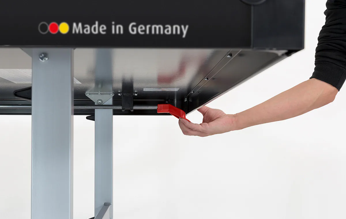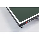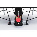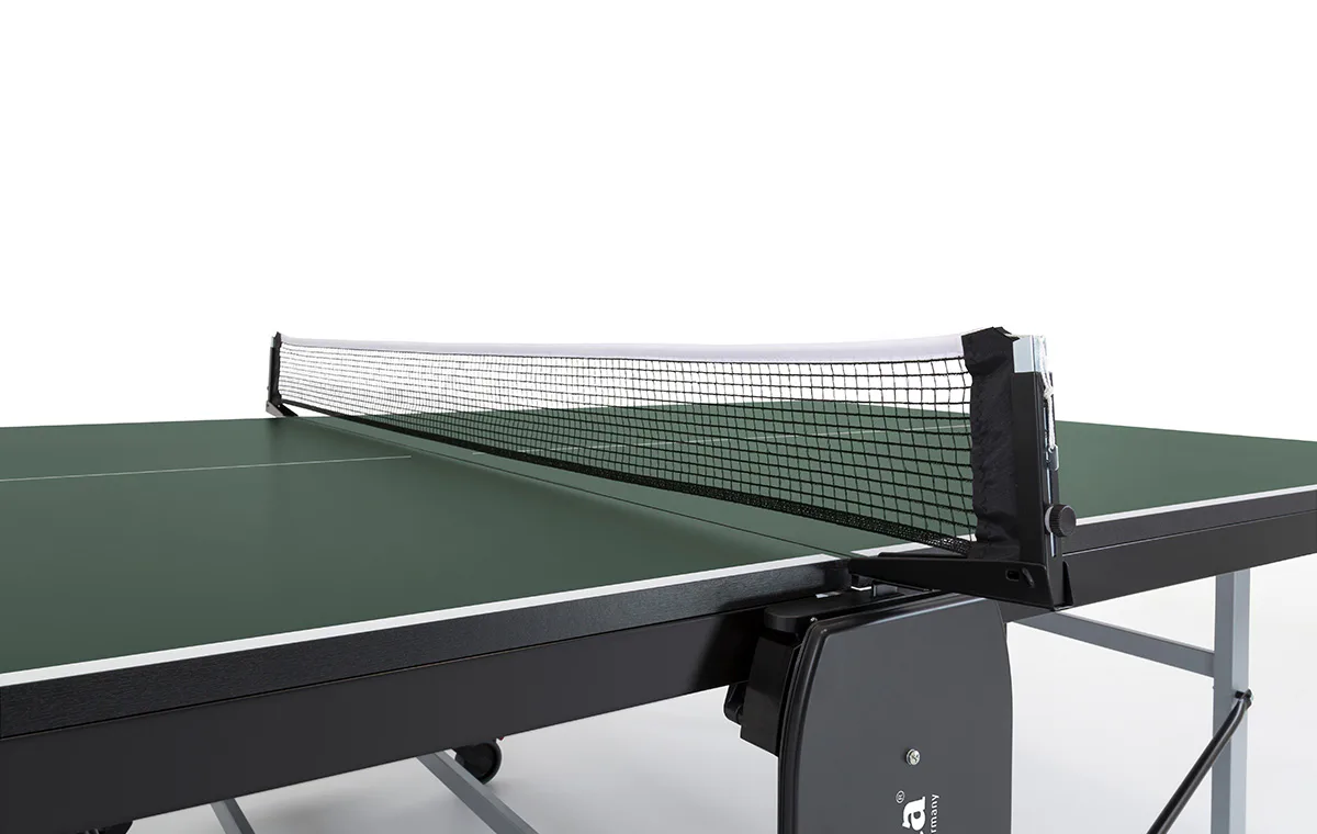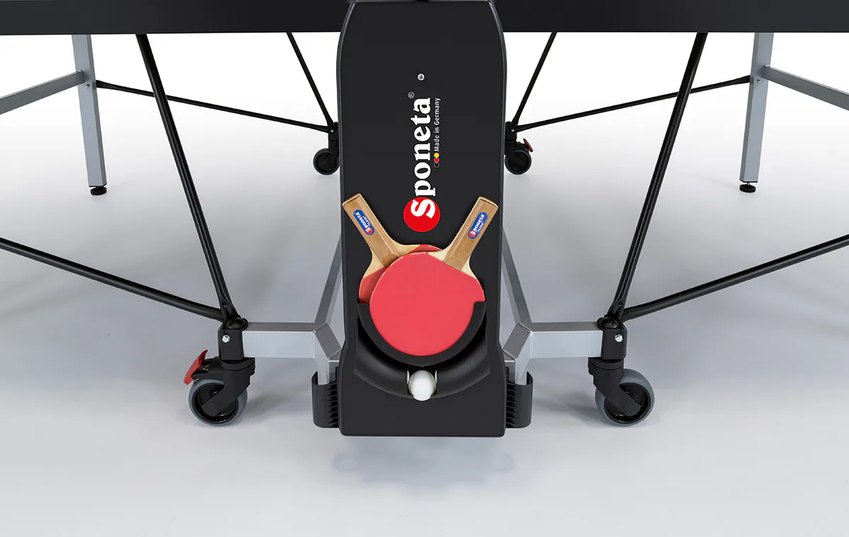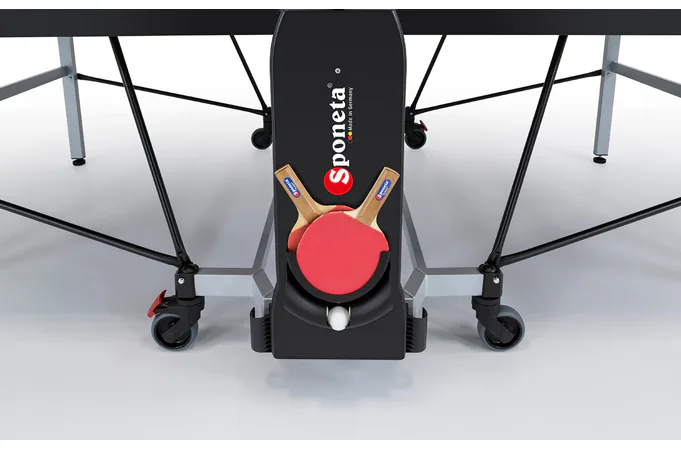Stůl je vyztužený kolem vnějších stran kovovými táhly. Vnitřní část stolu je opatřena čtyřmi kolečky na manipulaci ve složeném stavu, 2 kolečka mají aretaci proti pohybu. Uprostřed stolu je držák na míčky.
