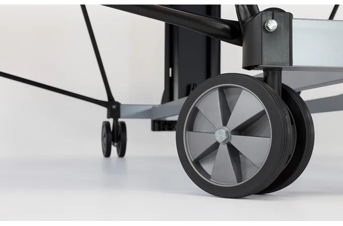Pevný rám z profilů 5 x 5 cm dává stolu velkou stabilitu rovnající se vnitřním stolům. Nohy stolu jsou opatřené plastovými šrouby na vyrovnání nerovností terénu. Součástí stolu je i kvalitní držák na síťku, síťka a držák na 2 pálky a 4 míčky.