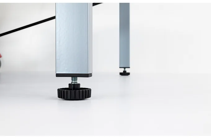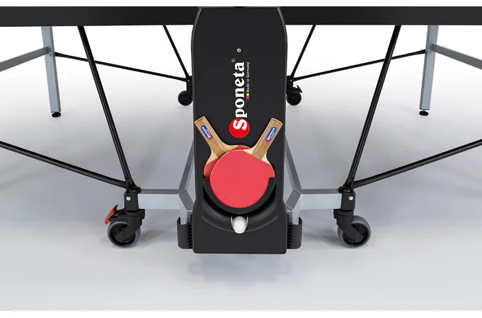 Stůl je vyztužený kolem vnějších stran kovovými táhly. Vnitřní část stolu je opatřena čtyřmi kolečky na manipulaci ve složeném stavu, 2 kolečka mají aretaci proti pohybu. Uprostřed stolu je držák na míčky.