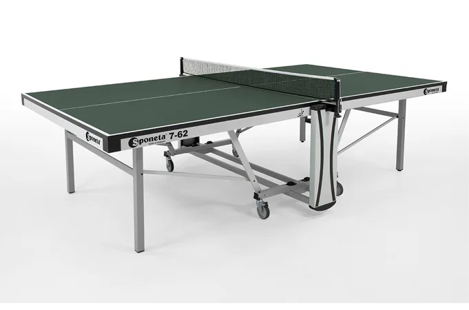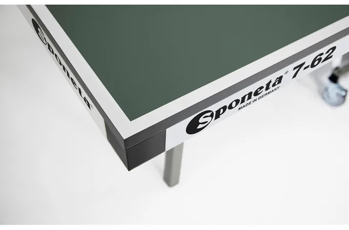 Pingpongový stůl Sponeta S7-62i má speciálně broušený povrch na 25 mm silné desce. Tato deska již zaručuje stálé vlastnosti pro závodní hru na nejvyšší úrovni. Deska je zespodu vyztužená ocelovým rámem 60 mm, který desku ještě dále zpevňuje. Nohy stolu jsou z eloxovaného hliníku 40 x 40 mm a mají seřizovací mechanismus na nastavení výšky a vyrovnání nerovností podlahy. Stůl je vyztužený silnými kovovými táhly, která zaručují 100% stabilitu stolu.