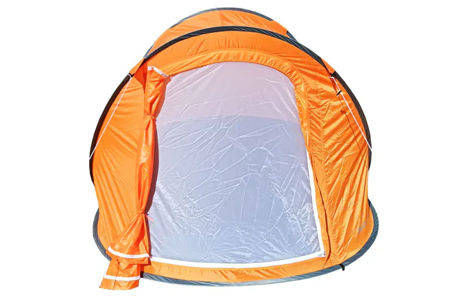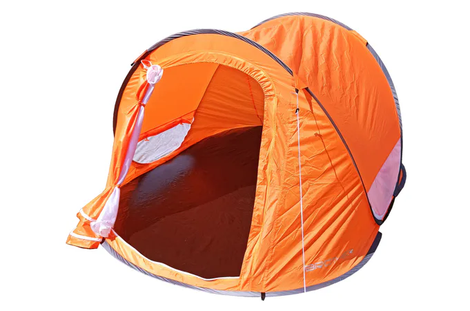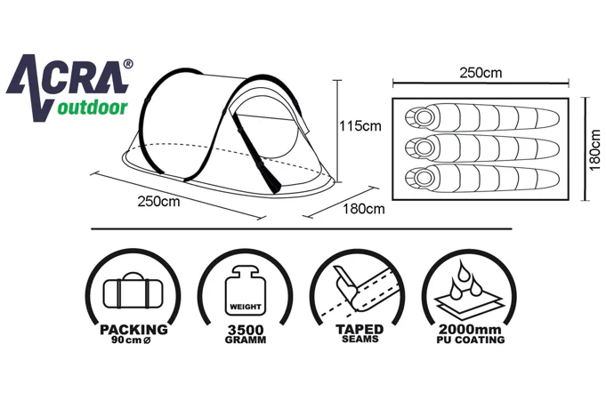 Samostavěcí stan pro 3 osoby. Jedná se o velmi skladný a jednoduše postavitelný stan. Navléknuté sklolaminátové pruty po vyndání z obalu stan kompletně postaví. Pak už jen stačí stan upevnit kolíky k zemi a dopnout plášť stanu kotvícími šňůrami kolem dokola. Demontáž je dobré provádět podle návodu, aby nedošlo k polámání sklolaminátových průtů.