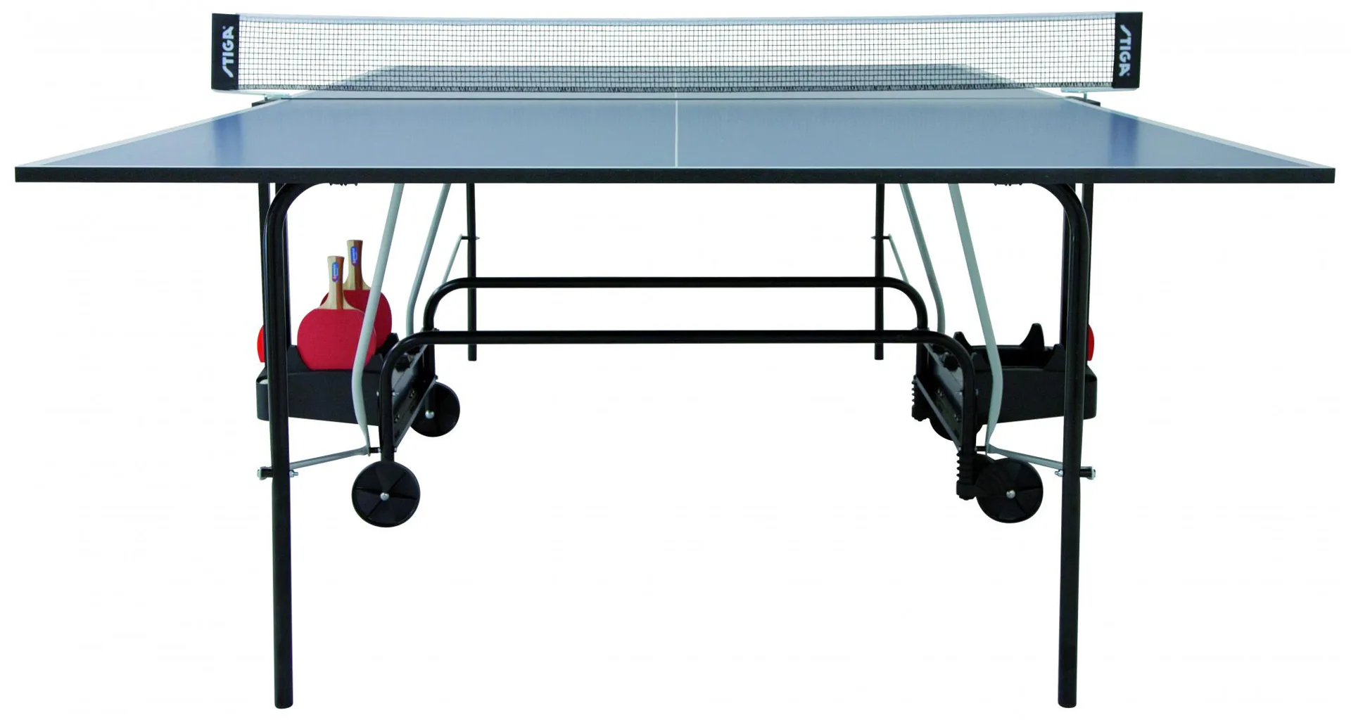 Stůl je dodáván včetně síťky a držáku na pálky a míčky.