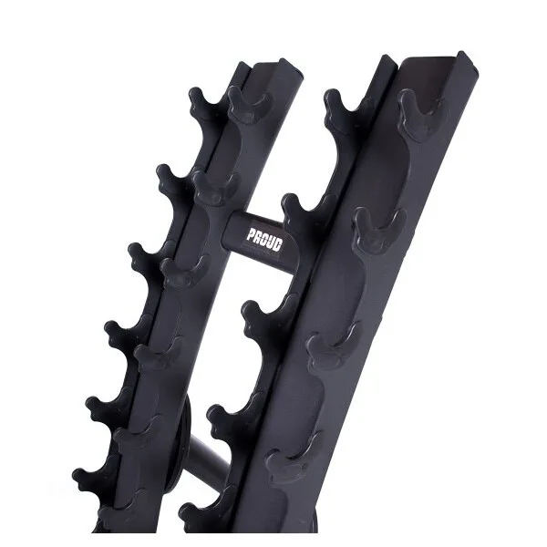 Stojan PROUD je koncipován pro uložení základní sady činek o 10-ti párech v rozsahu od 1 do 10 kilogramů. Háky jsou od sebe vzdáleny 11,5 centimetrů, to je také minimální délka, kterou musí mít úchopová část činky, aby šla do stojanu odložit.