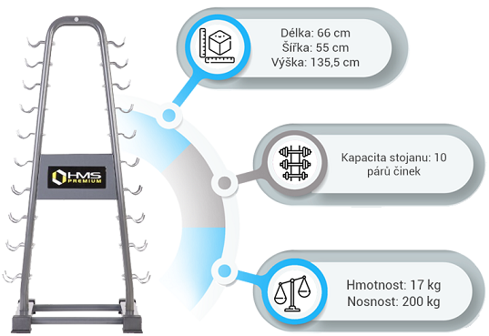 Stojan je navržen tak, aby bylo docíleno co nejvyšší bezpečnosti uživatele a uloženého nářadí. Jednotlivé háhy jsou konstruovány tak, aby se činky nejedn pohodlně ukládali, ale zároveň i velmi jednoduše odebírali. Stojan HMS STR07 pojme až 10 párů jednoručních činek a jeho celková nosnost je 200 kg.