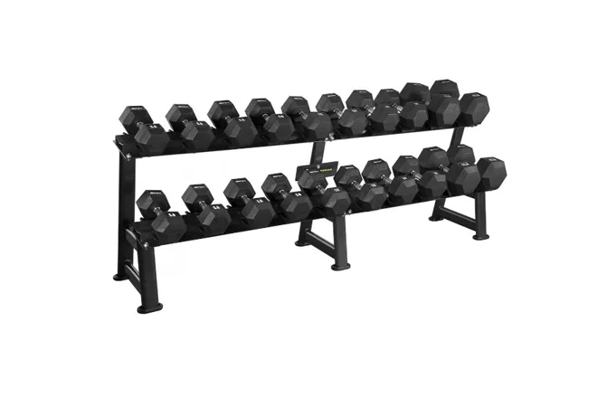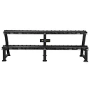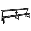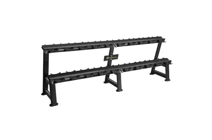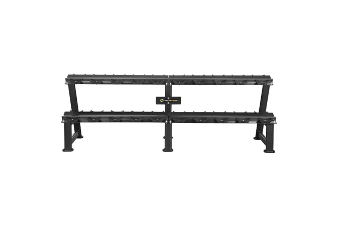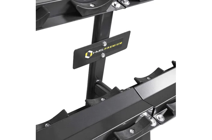 Stojan na jednoruční činky HMS Premium STR23 je ideálním pomocníkem pro uložení 10-ti párů činek. Kvalitní, ocelová konstrukce ja vyrobena z profilu 80 x 40 mm, díky tomu unese zatížení až 1000 kilogramů. Stojan má dvě "kolejnice" o rozměru 233 x 22 centimetrů, které jsou umístěny nad sebou pro snadnou orientaci mezi odkládaným náčiním. Ke každé polici jsou připevněny profilované, gumové podložky, do kterých se ukládají jednotlivé činky. Guma zamezuje pohybu činky a zároveň ji chrání před poškozením. Šest noh stojanu je opatřeno gumovými patkami, které chrání podlahu před jejím poškozením.