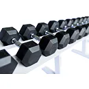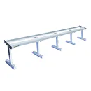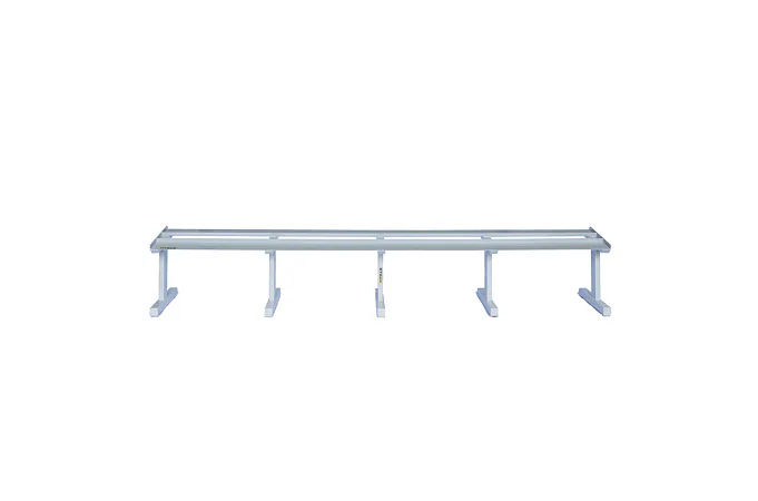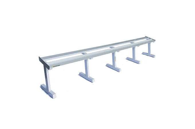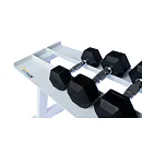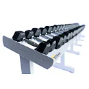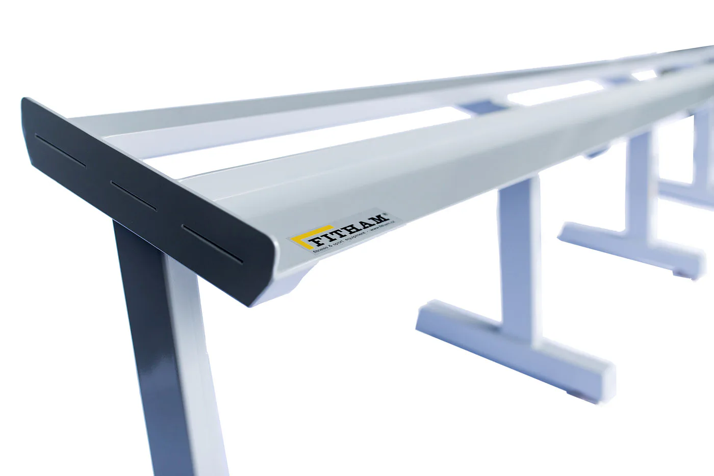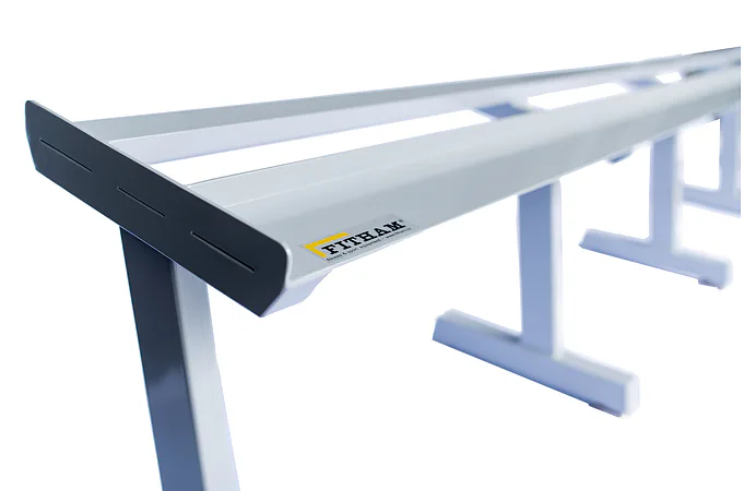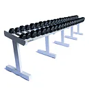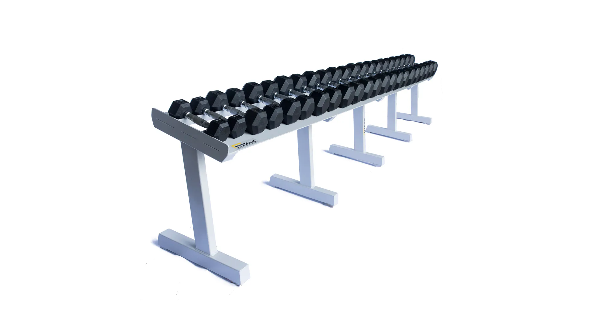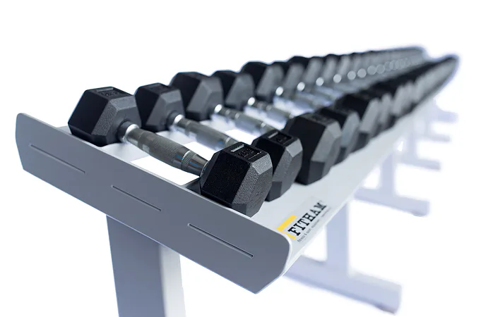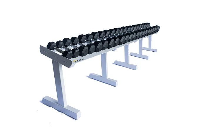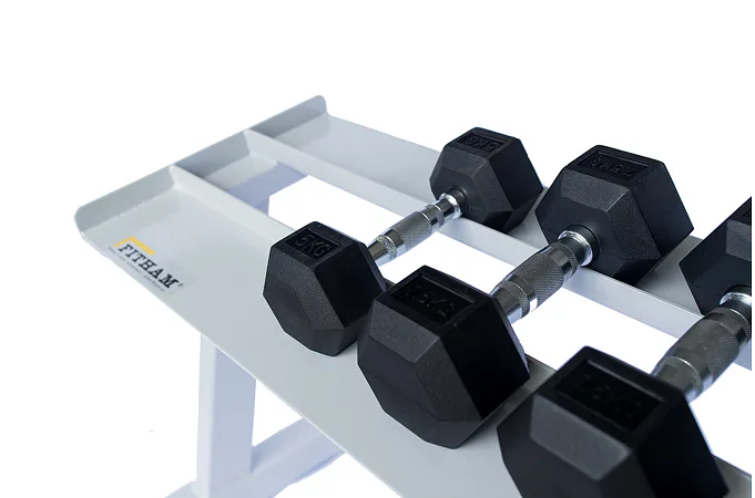 FITHAM Profesionální stojan na jednoručky 4 m je speciálně upravený stojan určený pro odkládání jednoručních činek typu HEXA a STYL, které nejsou složeny z kotoučů, ale tvoří je rukojeť a dva bloky litiny s pogumováním. Stojan má oproti obyčejným stojanům na jednoručky speciálně rozšířený odkládací profil aby činky větší plochou ležely na něm. Stojan je určený pro kluby a komerční fitnesscentra a je vyráběn na zakázku v požadované rozteči a barevném provedení.