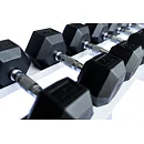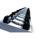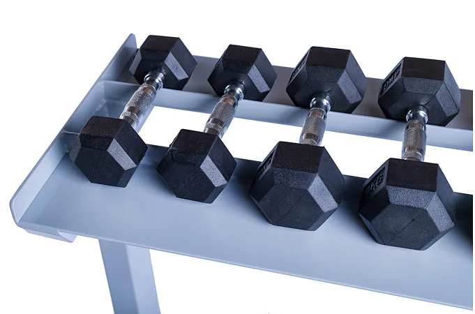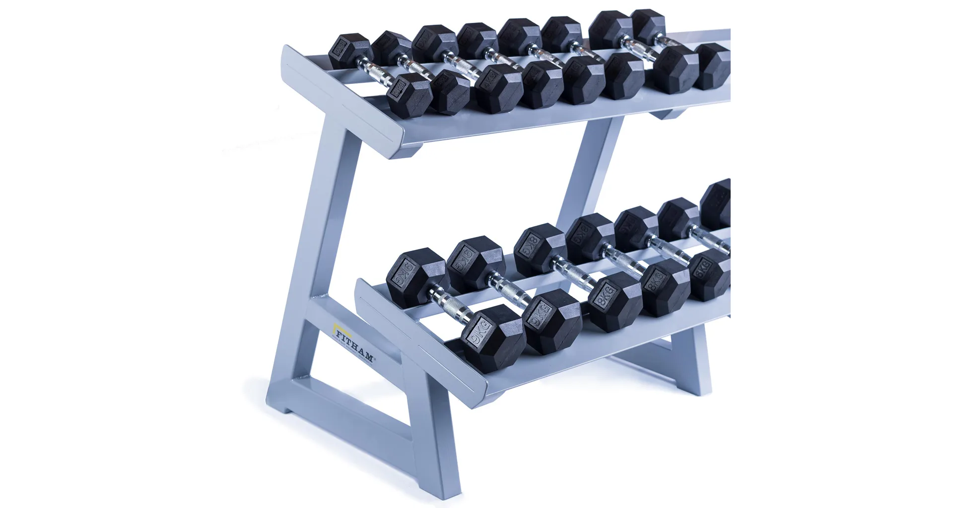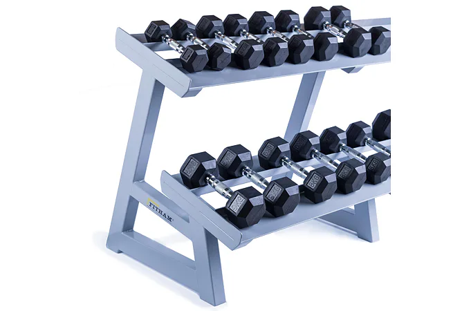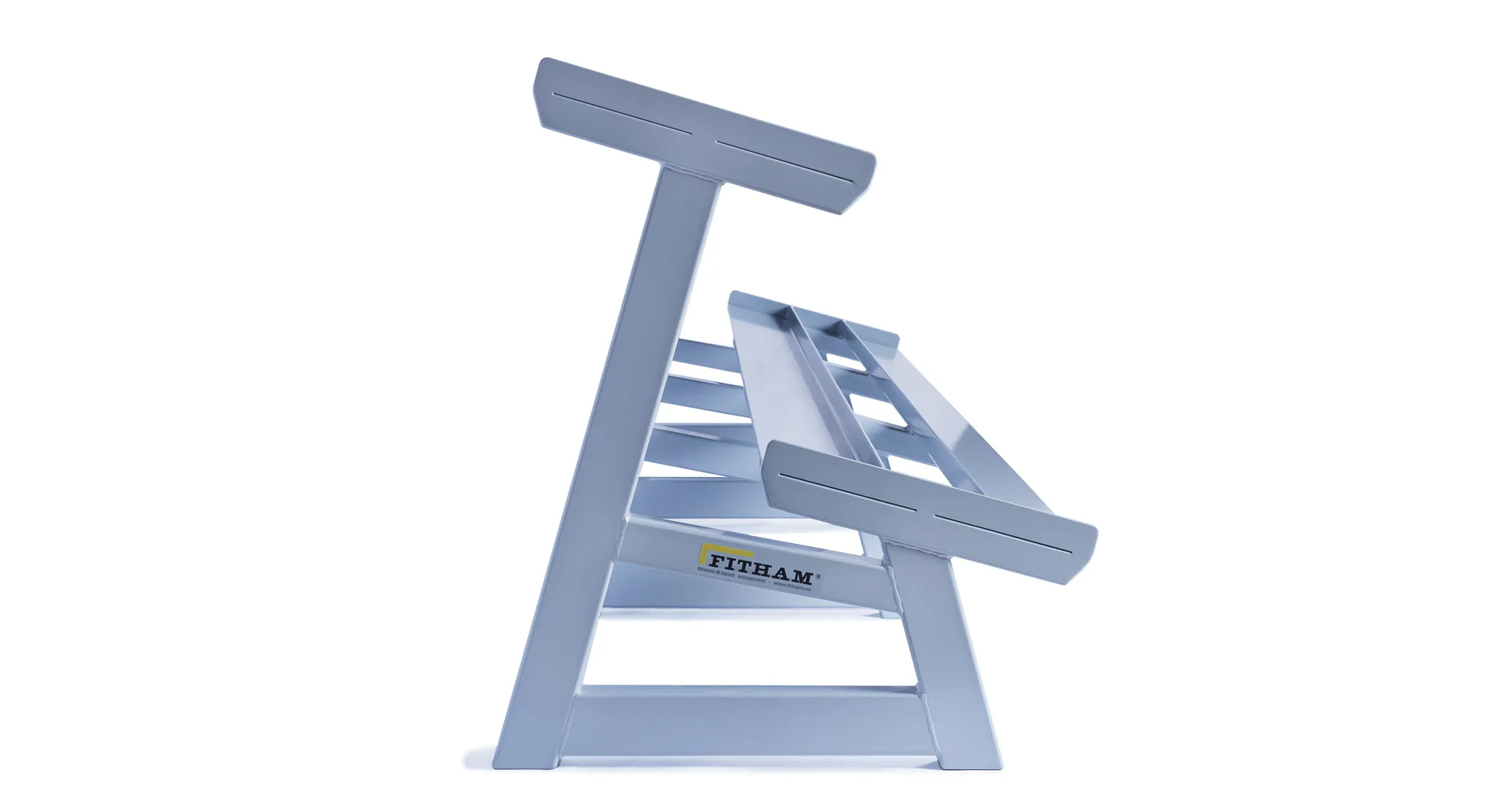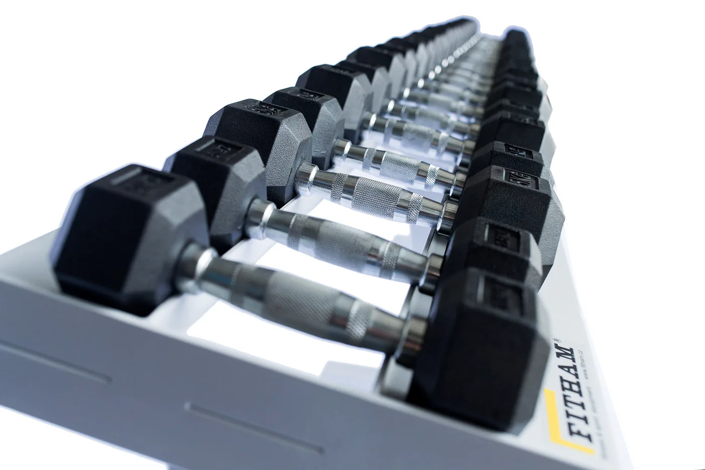 FITHAM Profesionální stojan na jednoručky 4 m dvouřadý je speciálně upravený stojan určený pro odkládání jednoručních činek typu HEXA a STYL, které nejsou složeny z kotoučů, ale tvoří je rukojeť a dva bloky litiny s pogumováním. Stojan má oproti obyčejným stojanům na jednoručky speciálně rozšířený odkládací profil aby činky větší plochou ležely na něm. Stojan je určený pro kluby a komerční fitnesscentra a je vyráběn na zakázku v požadované rozteči a barevném provedení.