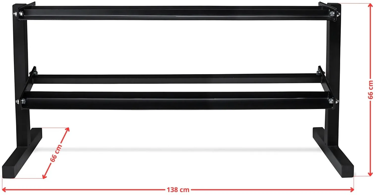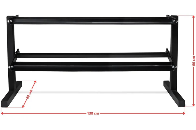 Na stojan VIRTUFIT Dumbbell Rack Pro Double můžete umístit jak hexa, tak klasické kulaté činky. Nosnost je 300 kg, což je dostatečné pro uložení i většího množství činek. Tento stojan na činky je vysoce kvalitní a poskytuje organizovaný a elegantní vzhled. Stojan má rozměry 138 x 47 x 66 cm a má ocelovou konstrukci, která zajišťuje jeho vysokou stabilitu.