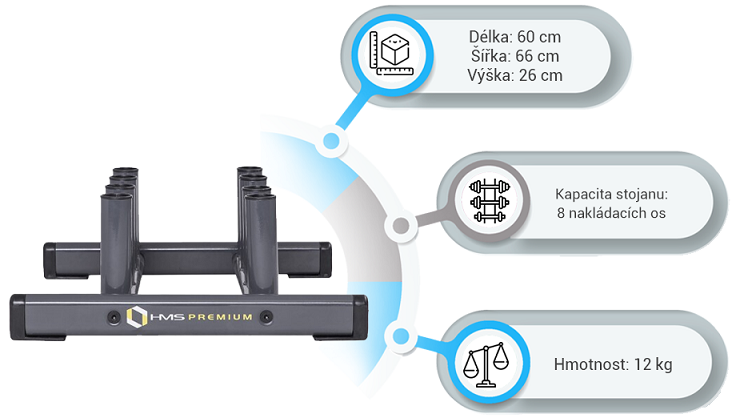 Stojen je dostatečně robustní a stabilní i při jeho plném obsazení. Je vyroben z kvalitní ocele a umožňuje uskladnění až 8 ks velkých činkových hřídelí. Průměry odkládacích otvorů jsou přizpůsobeny osám o průměru 50 mm.