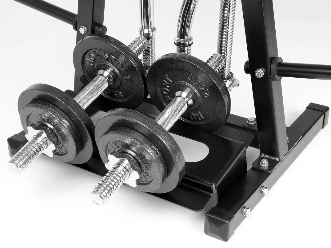 Na stojan je možné umístit i 2 jednoruční činky a díky tomu je možné na stojan umístit celou malou domácí posilovnu. Úchyty na osy jsou o průměru 30 mm, nicméně dají se do nich pohodlně umístit osy o průměru 25 mm. Trny na kotouče jsou o průměru 25 mm.
