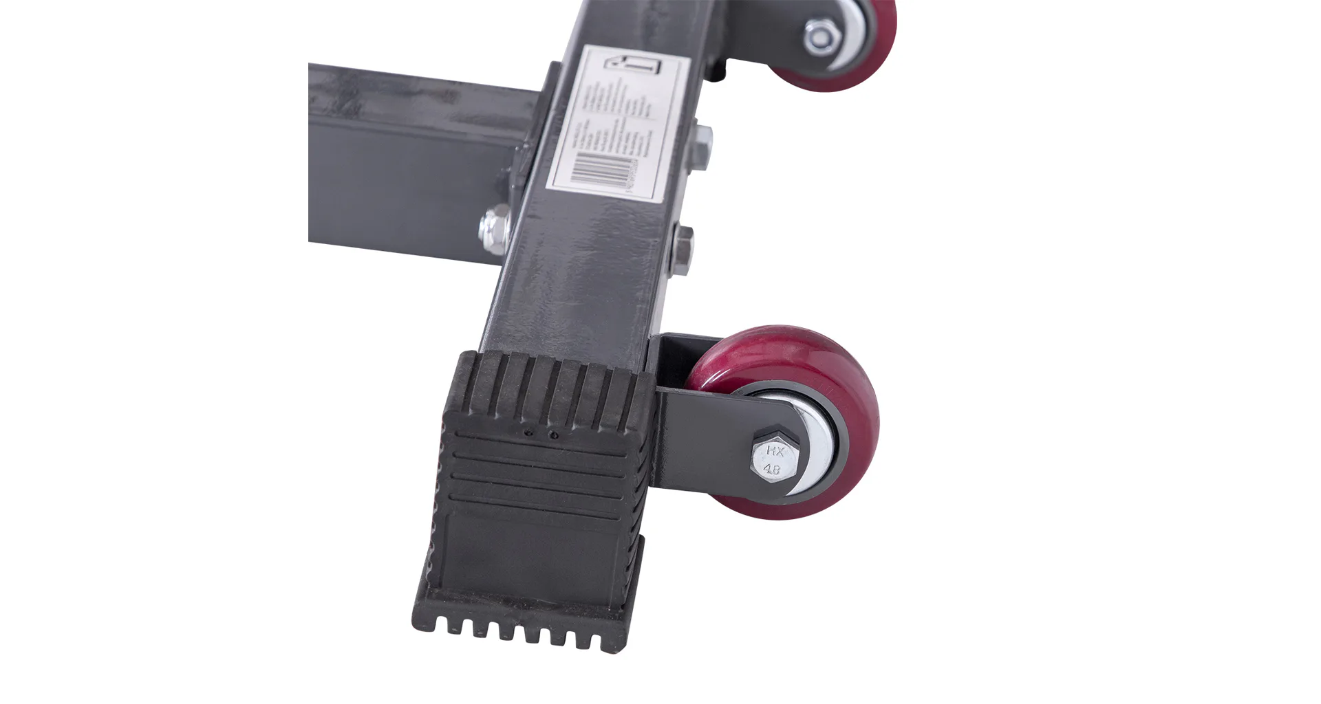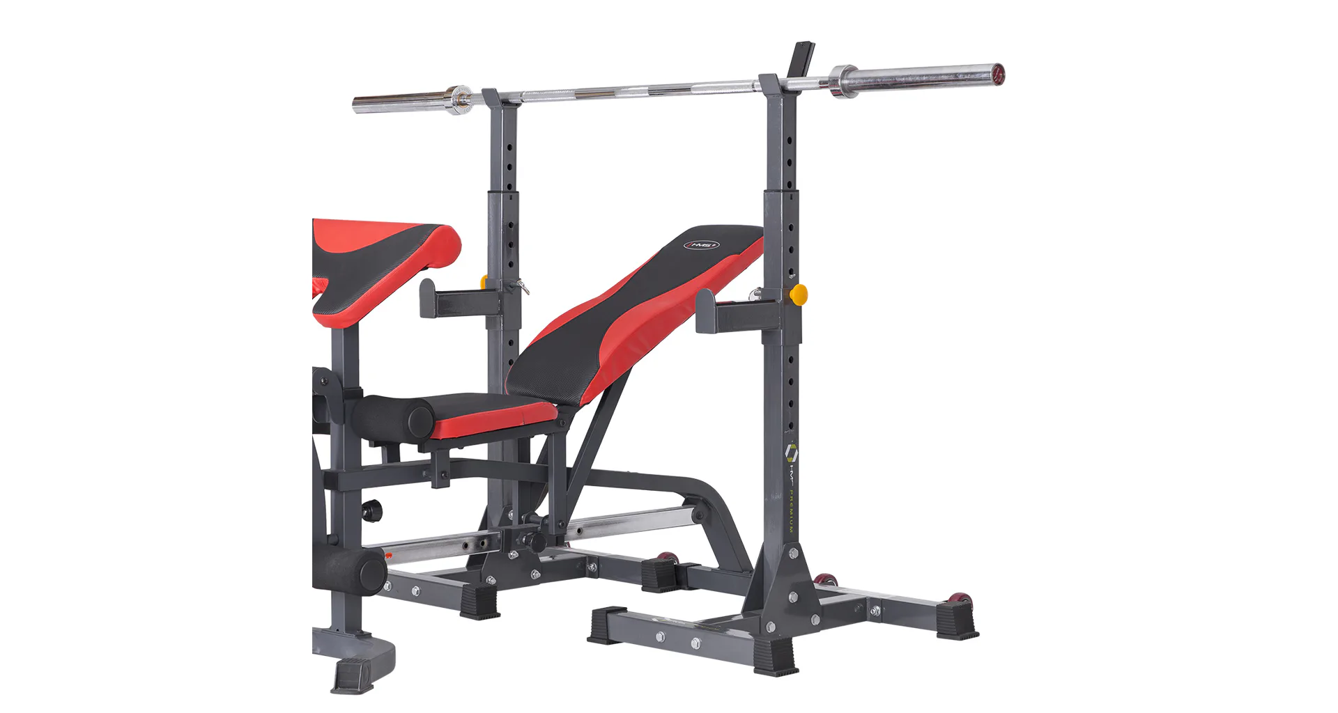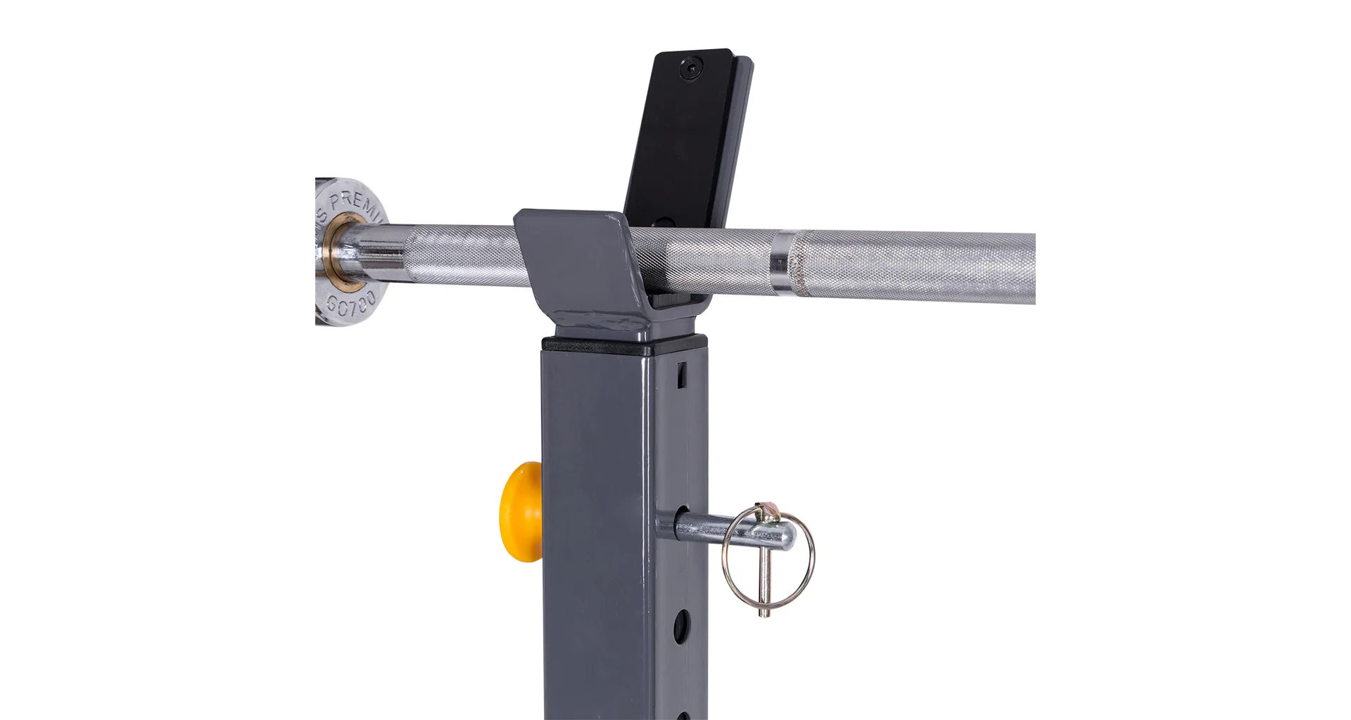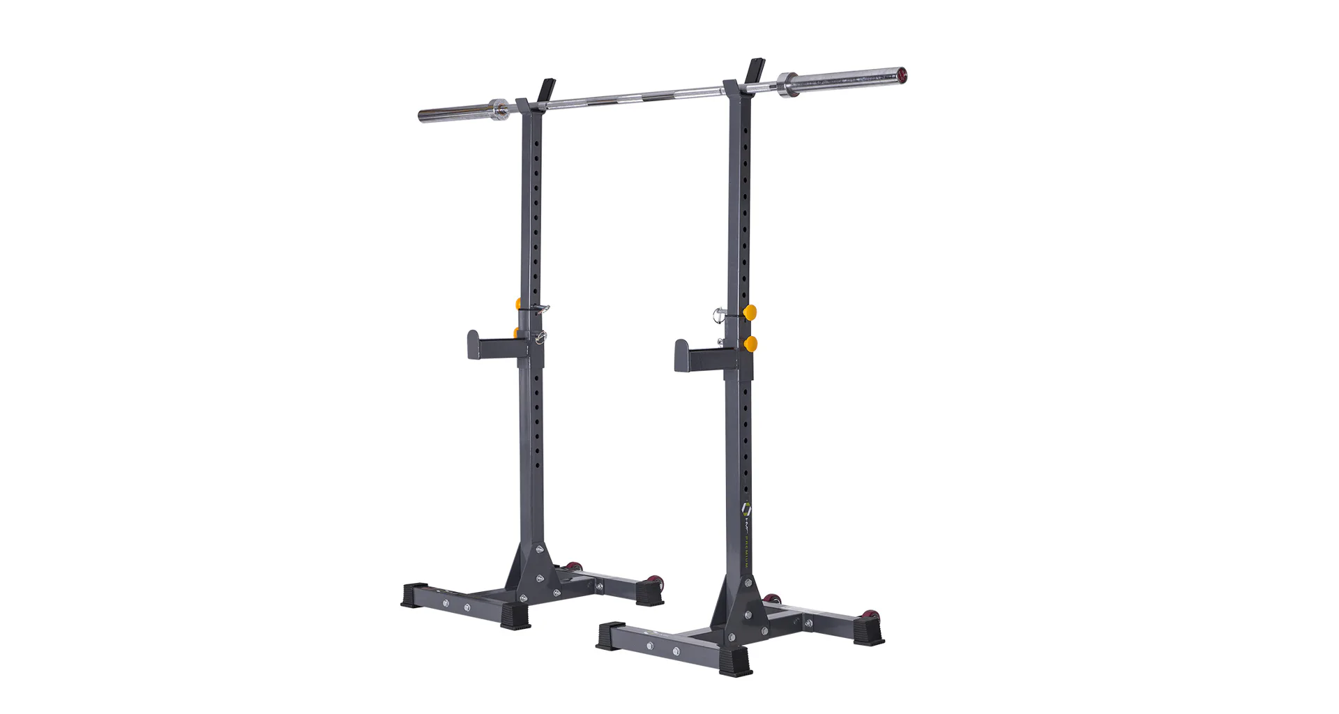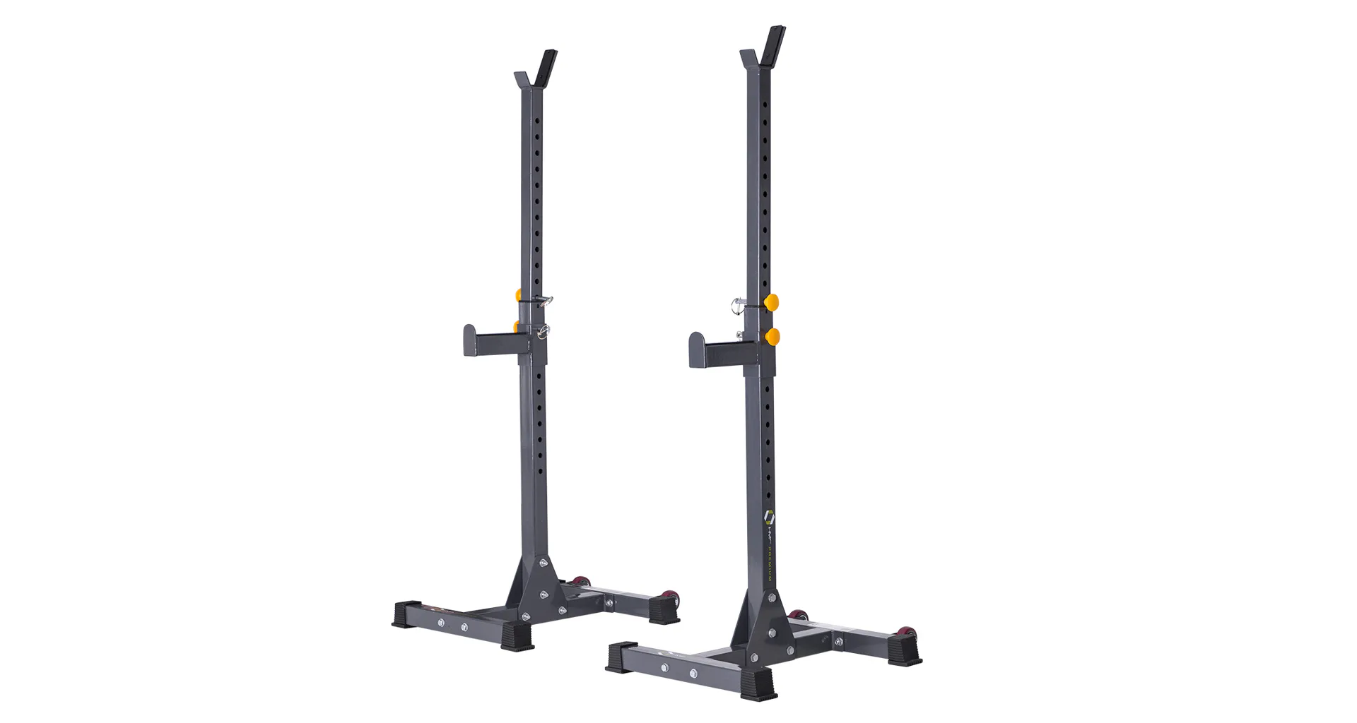 Stojany mají dále v základní výbavě také 21 cm dlouhé jistící trny pro trénink s lavičkou. Ty je možné na stojan ukotvit ve výšce 48 - 93 cm. Navíc jsou odkládací plochy pro činku opatřeny gumoplastovými pásky pro větší bezpečnost a to jak uživatele, tak i používaného nářadí. Výšku jistících trnů nebo stojanů nastavíte velice jednoduše díky kolíkům s pojistnou závlačkou. Pro pohodlné přemístění stojanů, jsou oba vybaveny transportními kolečky.