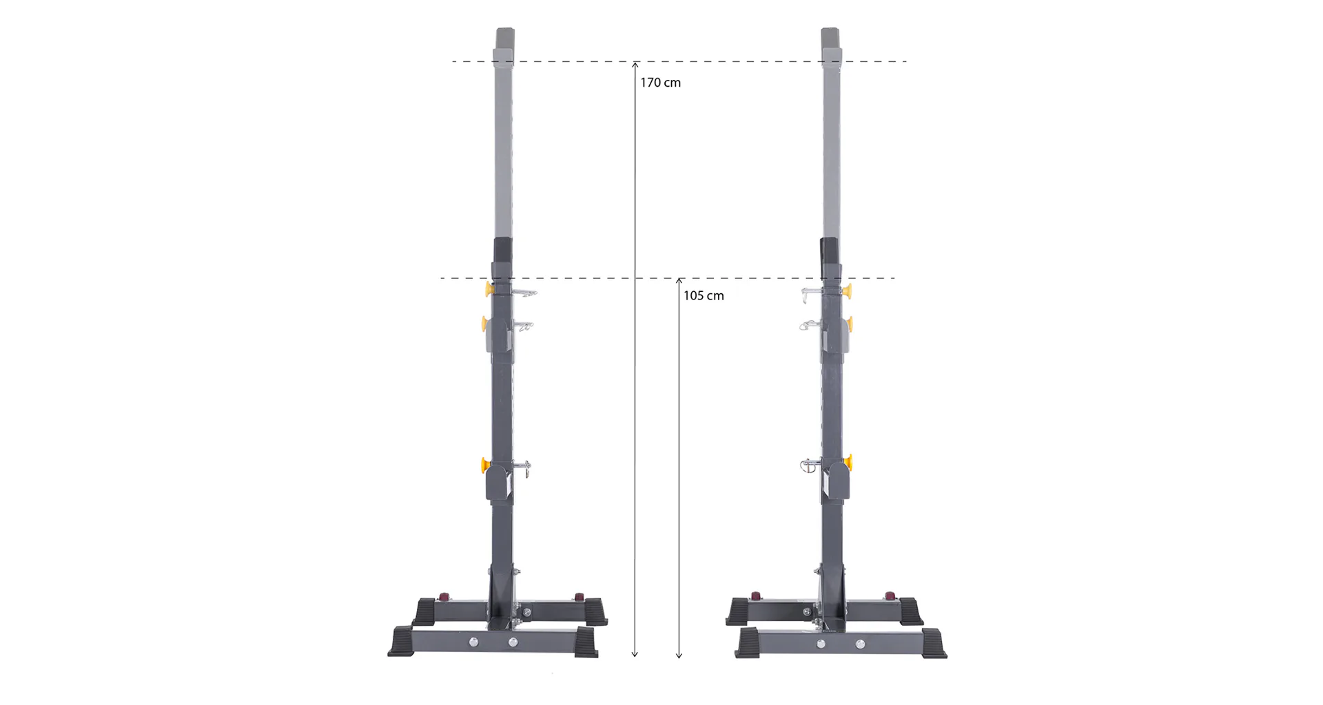 Velkou výhodou stojanů je jejich variabilita ať už ve výšce, kdy je možné využít rozpětí od 105 do 170 cm nebo i v šířce, kdy je možné stojany využít v podstatně na všechny délky velkých činkových os. Stojany jsou vyrobeny z kvalitní ocele a unesou až 400 kg zátěž.
