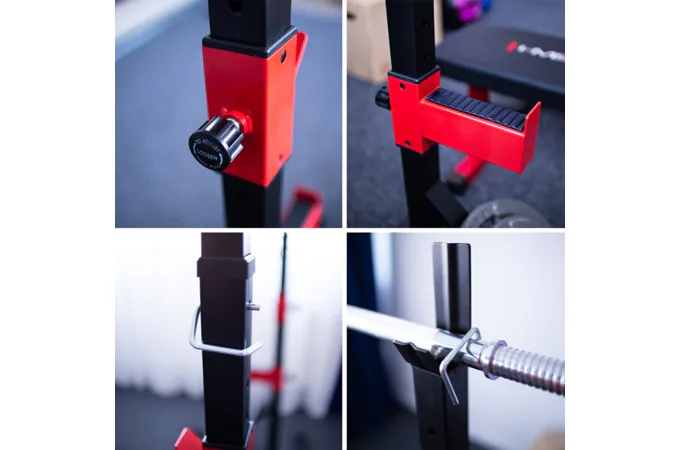 Zařízení bylo vybaveno podpěrami, které zajišťují bezpečnost při tréninku s těžkými váhami. Výšku podpěr lze nastavit, takže si je můžete přizpůsobit svým potřebám. Díky nim můžete trénovat například bench press bez sparingpartnera.