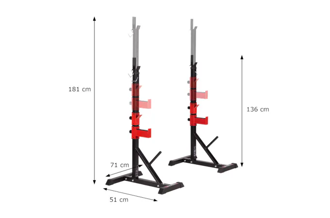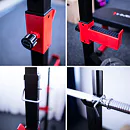Výrobek má také úchyty, do kterých můžete uložit činku. První úchyt je umístěn na výsuvné tyči, zatímco druhý lze posouvat po spodní části rámu. Úchyty jsou profilované, aby zabránily sklouznutí činky.