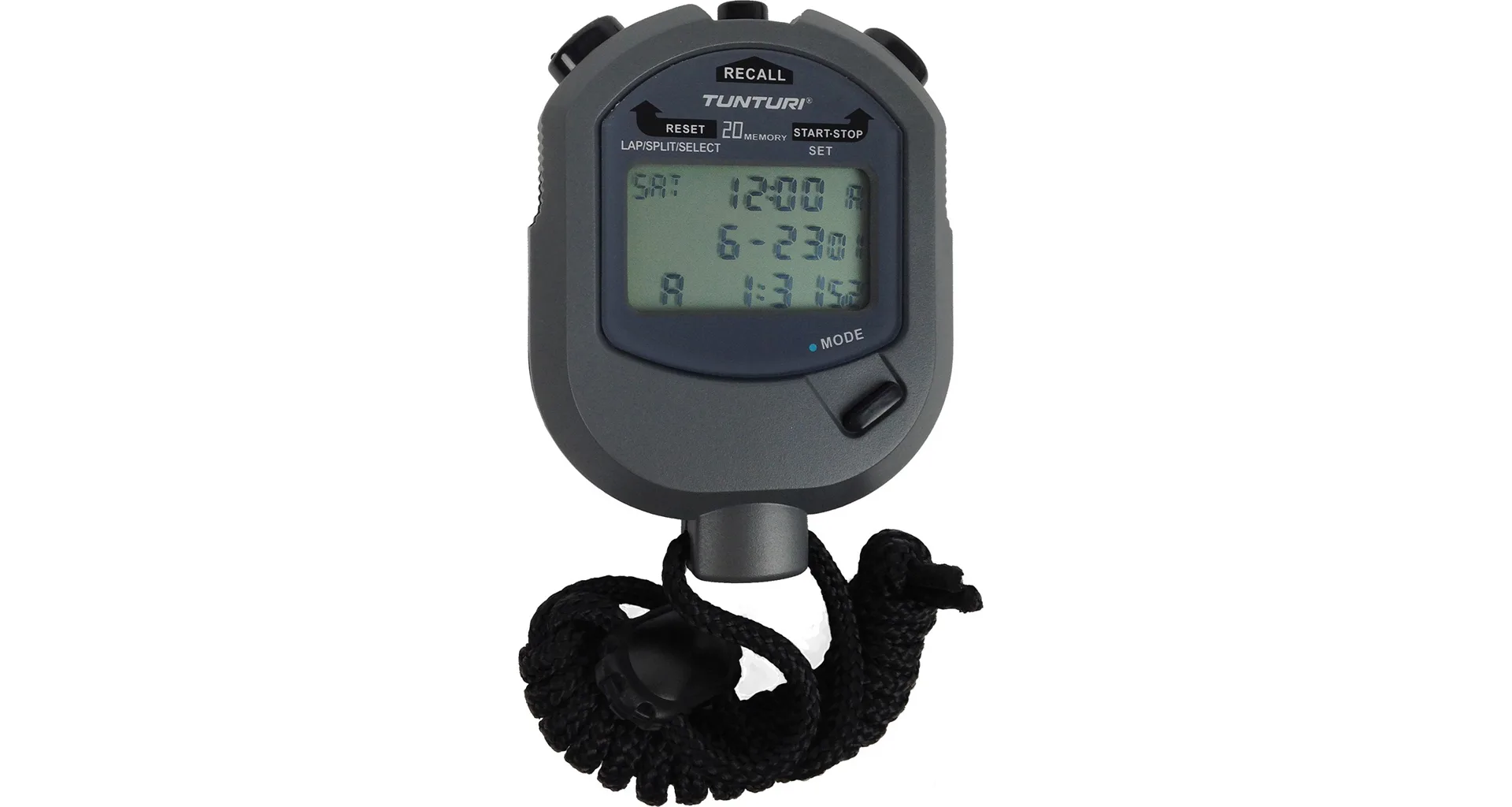 Stopky - 20 pamětí TUNTURI s digitálním ztvárněním času, dne, měsíce, hodin, minut a sekund. Kromě toho má stopky velký displej a dvacet pamětí a odpočítávání času. Voděodolné provedení.
