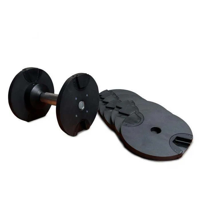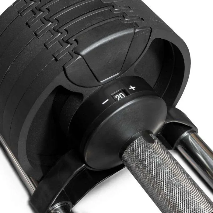 Tento set obsahuje činku s volitelnou hmotností od 2 do 20 kg. Bezpečný trénink a snadnou manipulaci zajišťuje patentovaný blokovací mechanismus. Samotná hmotnost lze upravit pouze v okamžiku kdy je činky uložena v základním stojanu, který je samozřejmě součástí balení. Všechny váhové desky jsou pogumovány, takže chrání podlahu před poškozením, ke kterému by během cvičení mohlo dojít