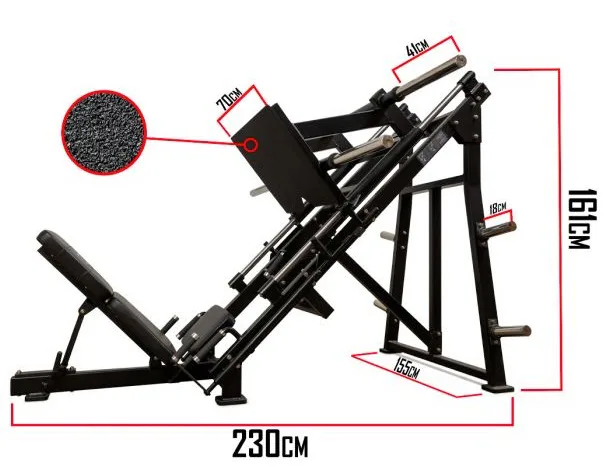 Stroj je vybaven polohovatelnou zádovou opěrkou a praktickými rukojeťmi pro maximální stabilitu při tréninku. Veškerý tlak směřujeme do pojízdné platformy, na kterou přidáváme zátěž v podobě kotoučů. Podle postavení a rozsahu pohybu můžeme posilovat různé svalové partie na nohou (stehna, hýždě, lýtka) a jejich části. Leg press je vybaven nastavitelnou bezpečností pojistkou, kterou lze nastavit v různých výškových úrovních.