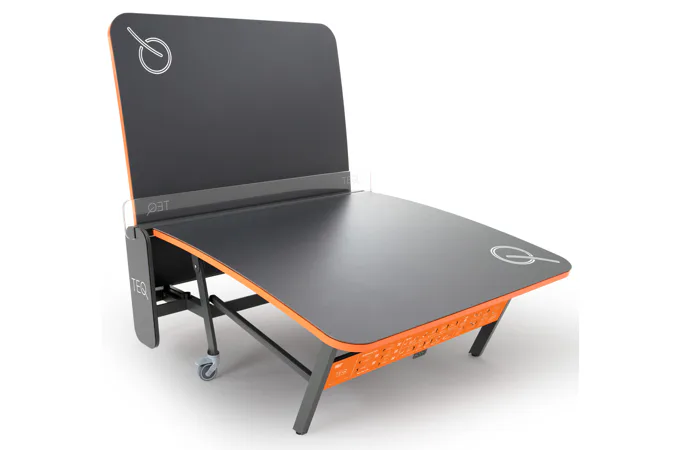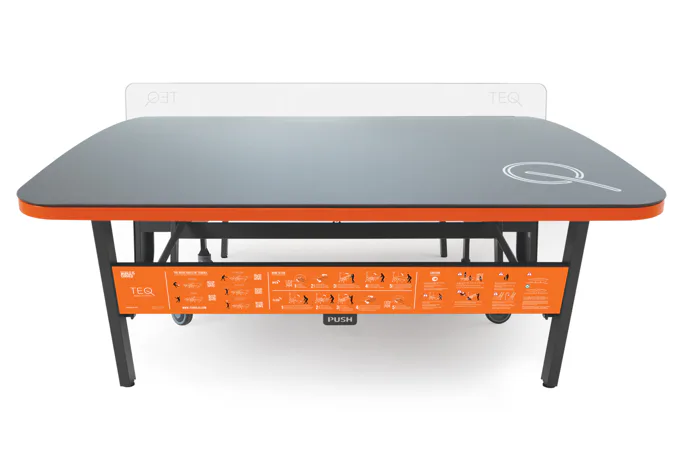 Teqballové stoly jsou vyrobeny tak, aby splňovaly náročné standardy kvality a trvanlivosti, přičemž TEQ™ SMART má další výhodu v tom, že se snadno přemisťuje na jakékoli místo, jak ve vnitřních, tak venkovních prostorách. To je možné díky přidání uzamykatelných kol a sklopné konstrukci.