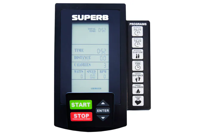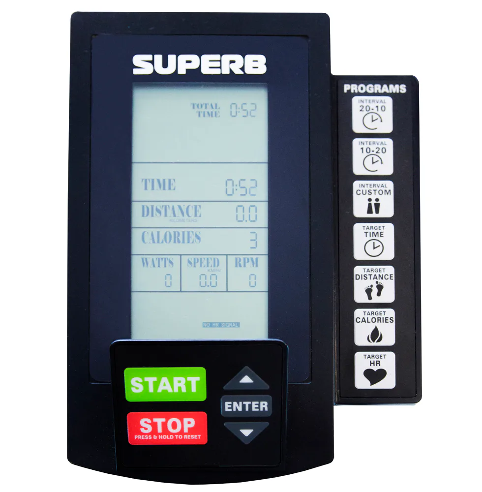 Z programové nabídky nabízí SUPERB AIR BIKE několik tréninkových režimů a trvale zobrazuje na svém LCD monitoru hodnoty jako je čas, vzdálenost, RPM otáčky, spálené kalorie, výkon (watt) a tep. Tepová frekvence je snímatelná hrudním pásem o nekodované frekvenci 5 kHz, který není součástí dodávky, ale je možné jej dokoupit.